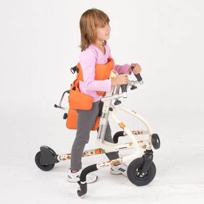 Небольшой наклон тела в ходунках способствует смещению центра тяжести. Такое положение стимулирует движение нижних конечностей. Колеса облегчают передвижение и помогают социальной активности ребенка. Ручные опоры оборудованы не скользящими накладками.