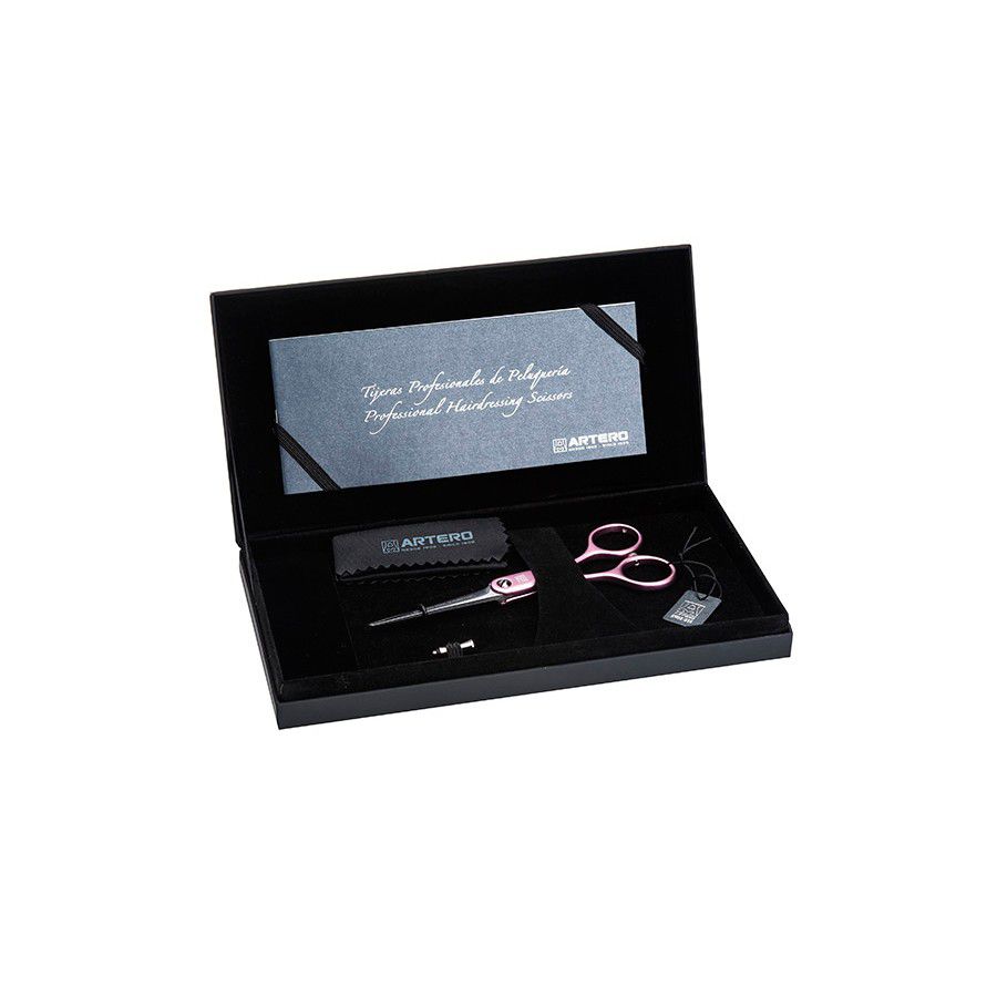 Ножницы Pink Symmetric T46255 от испанского бренда Artero – профессиональная модель, изготовленная из качественной японской стали 9CR. Инструмент оснащён легкой ручкой из твердого алюминия нежно-розового цвета, что делает его буквально невесомым в руках мастера. Их вес всего 26 грамм! Надежная классическая форма со съемным упором и вогнутые, острые как бритва полотна позволят работать практически во всех техниках, включая слайсинг.