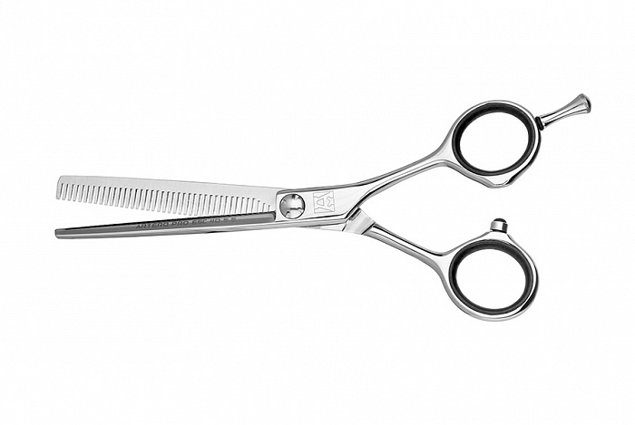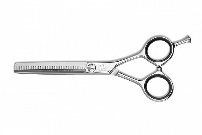 Ножницы филировочные Pro T47655 изготовлены из высокопрочной японской стали. Вогнутые плотна, съёмный упор и острые как бритва режущие кромки, одна из которых филировочная с 40 зубцами, позволят без труда выполнить бережную и контролируемую филировку, создать объём и плавные переходы на финальных этапах стрижки. Оснащены регулируемым винтом с системой Soft-System, обеспечивающим максимальную плавность работы режущих кромок и мягкий ход полотен.