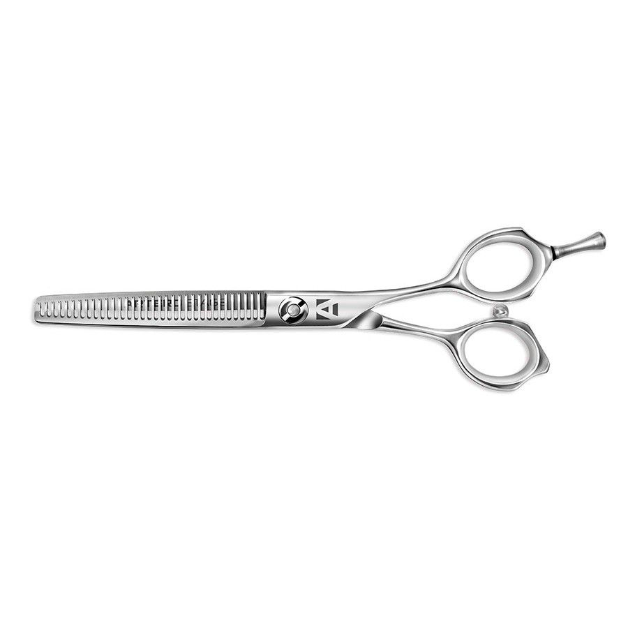Вогнутые плотна, съёмный упор и острые как бритва режущие кромки, одна из которых филировочная с 34 зубцами, позволят без труда выполнять бережную и контролируемую филировку, создавать объём и плавные переходы на финальных этапах стрижки. Данная модель срезает до 25% волос из пряди.