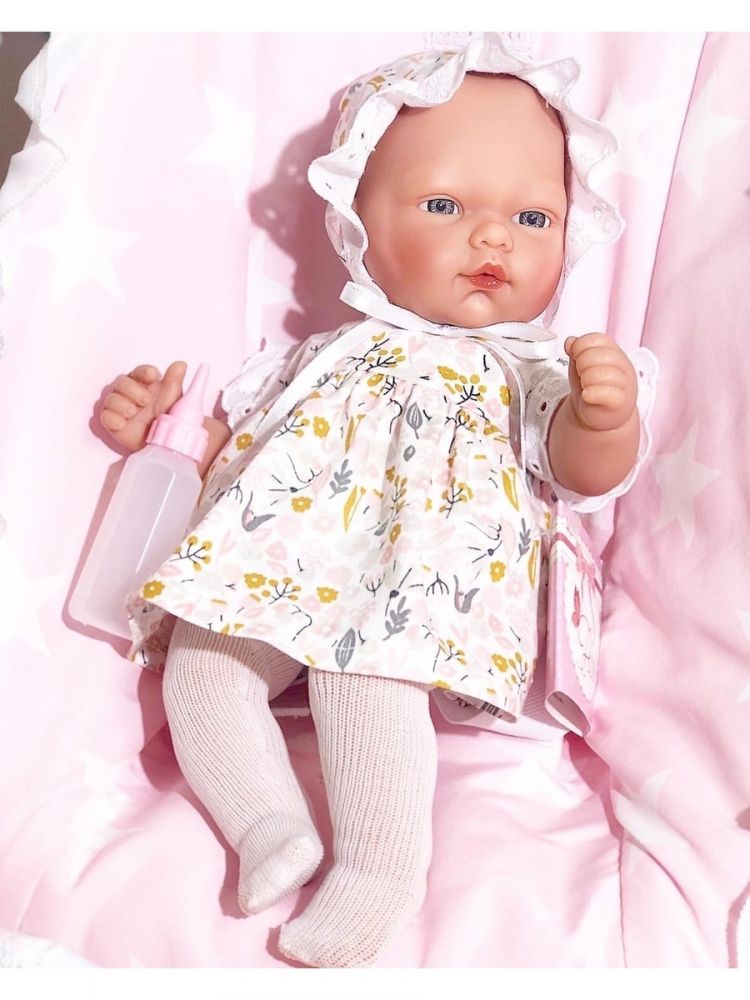 Одета в очень красивое платьице с рюшами, чепчик и колготки. В комплекте бутылочка.