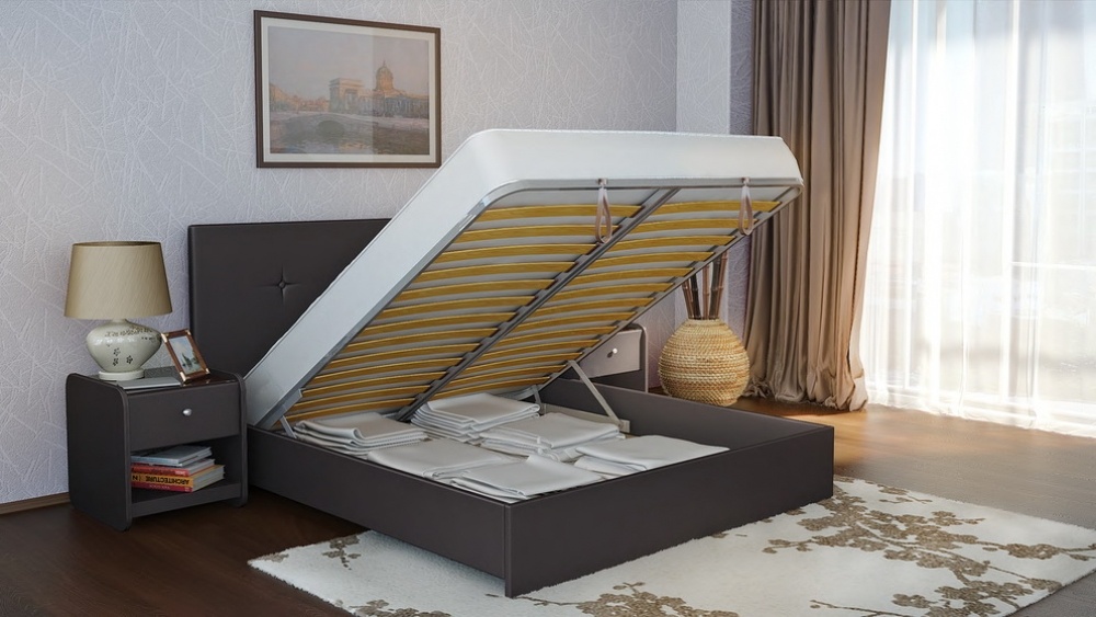 Кровать оснащена подъемным механизмом, что обеспечивает новые современные возможности в эксплуатации. Эту мебель для спальной комнаты отличает безукоризненное качество, аккуратный и стильный дизайн. Двуспальная кровать выполнена из натуральных древесных материалов, которые обладают высокой прочностью, способны выдерживать высокие ежедневные нагрузки. Конструкция – продумана до мелочей, поэтому снижается рис истирания царг с несъемными чехлами, и кровать легко застилается постельным бельем. Обивка изготовлена из мягкой и дышащей искусственной кожи в светлых оттенках, что выглядит очень презентабельно.