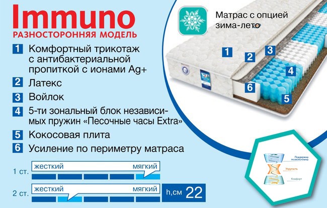 Мягкий и нежный или жесткий и упругий – матрас Askona Immuno сочетает все эти качества и позволяет менять характеристики спального места в соответствии со своими текущими потребностями. Блок независимых пружин «Песочные часы Extra» с пятью зонами аккуратно, но уверенно поддерживает позвоночник во время сна. Одна сторона усилена кокосовой плитой, а другая имеет мягкую подкладку из латекса и войлока, что придает ей непревзойденное удобство. Покрытие из бельгийского трикотажа обеспечивает свежесть и гигиеничность спального места, а высокоэластичная пена в чехле создает дополнительный комфорт.