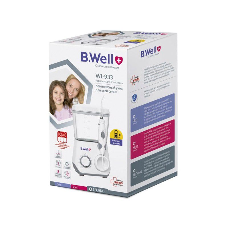 B.Well WI-933 - стационарный ирригатор для всей семьи. Это единственный Ирригатор, который работает как от сети, так и автономно от аккумулятора. А беспрерывное время работы составляет до 50 минут.