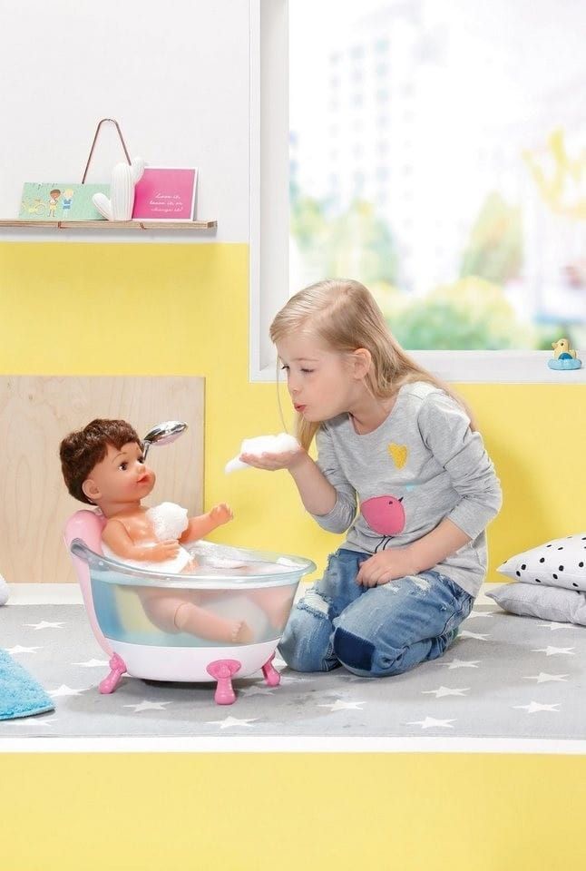 Кукла умеет стоять, пить из бутылочки (входит в комплект) и плакать. А еще его можно купать!