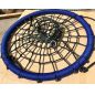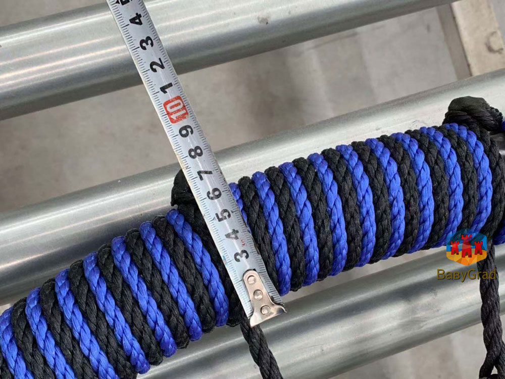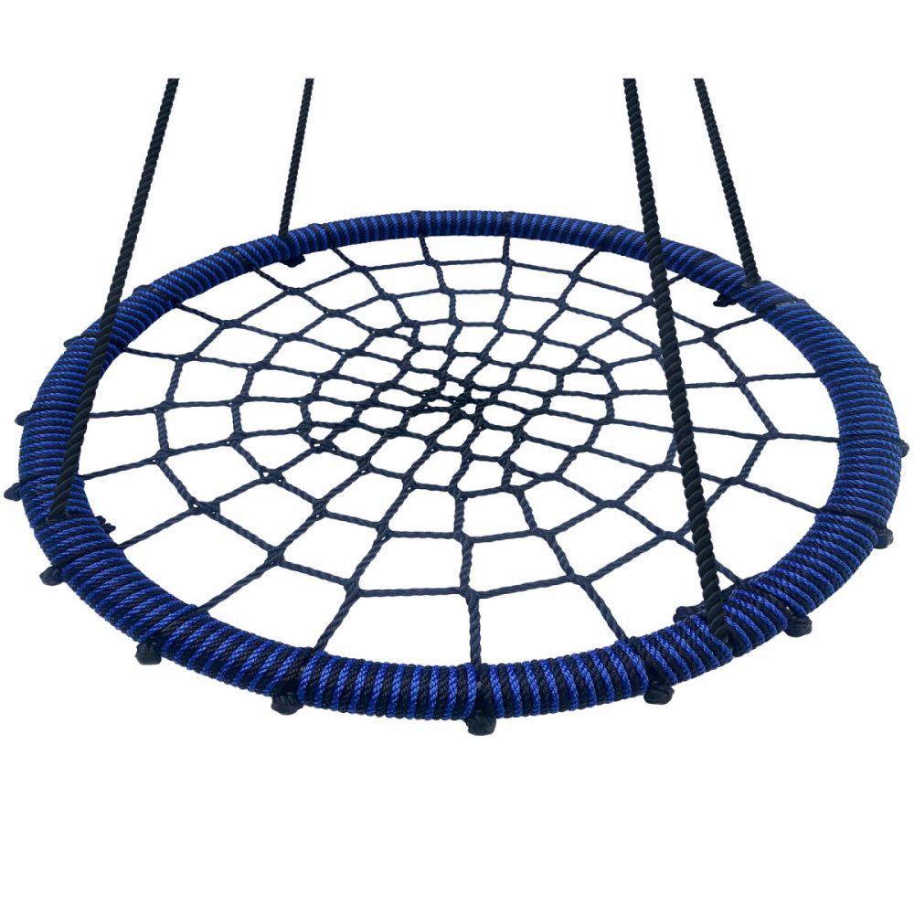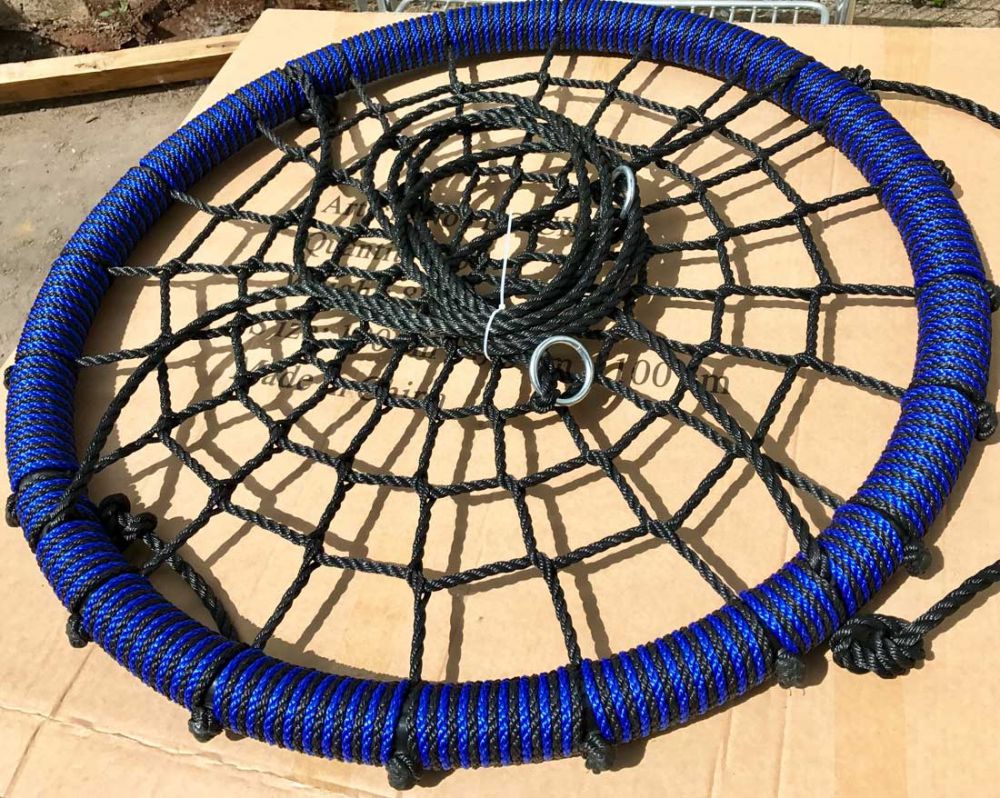 Круглая рама качелей произведена из стальной трубы с полимерным покрытием, диаметром 45 мм и толщиной стенки 1,5 мм, диаметр кольца в обмотке - 6 см. Оплетка рамы и сетка-паутина выполнена из высококачественного полиамидного каната, устойчивого к ультрафиолетовому воздействию, диаметр каната сетки-паутины - 10 мм, диаметр каната подвесов - 12 мм, диаметр каната оплетки рамы - 8 мм.