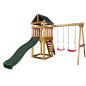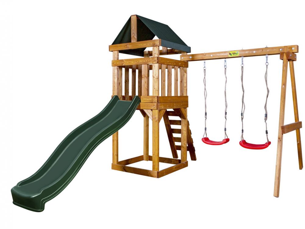 Конструкция имеет эргономичную форму и не травмоопасная, что особенно важно для малышей. Игровая площадка изготовлена из хвойной древесины северных пород, обработана гипоаллергенным покрытием на водной основе (не содержит токсичных растворителей). Навесное и игровое оборудование сделано из экологически безопасного пластика, металлические элементы из высокопрочной оцинкованной стали.