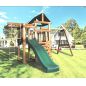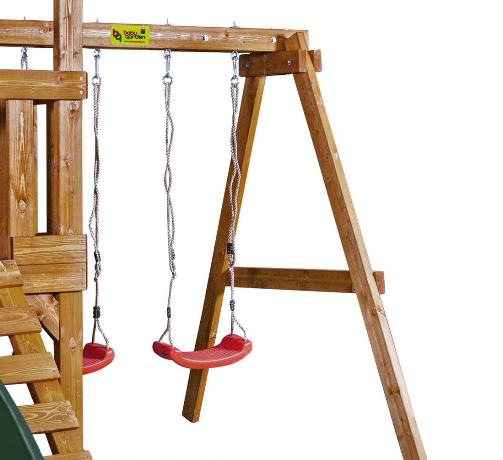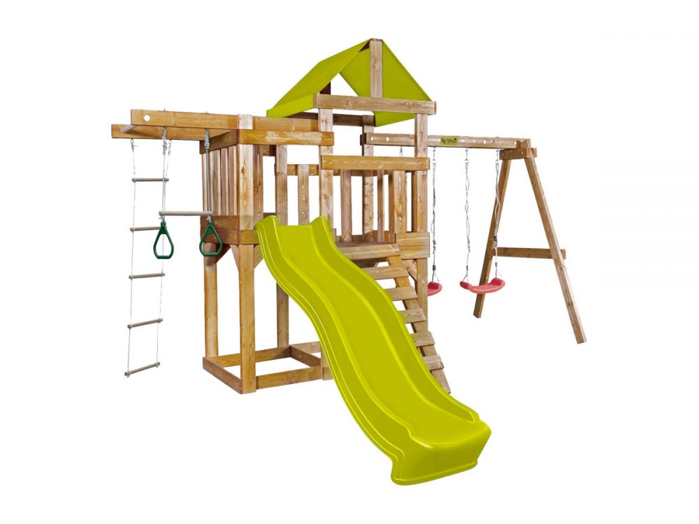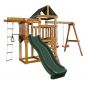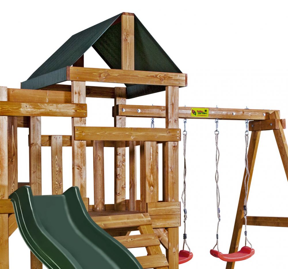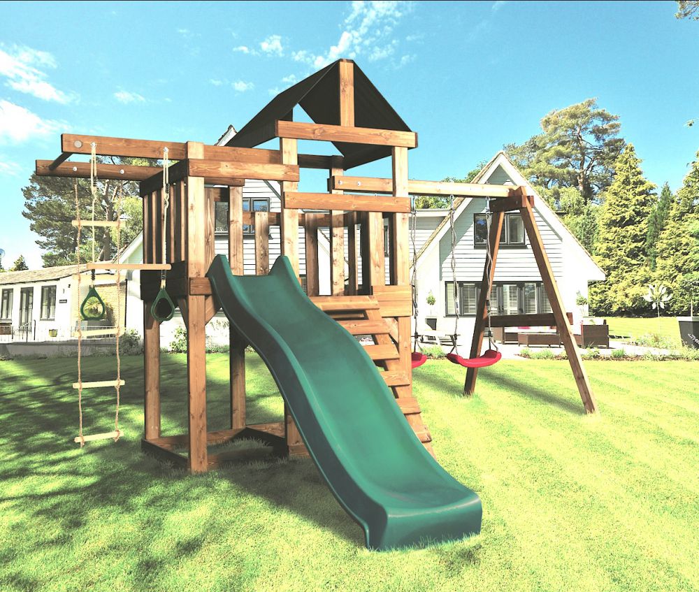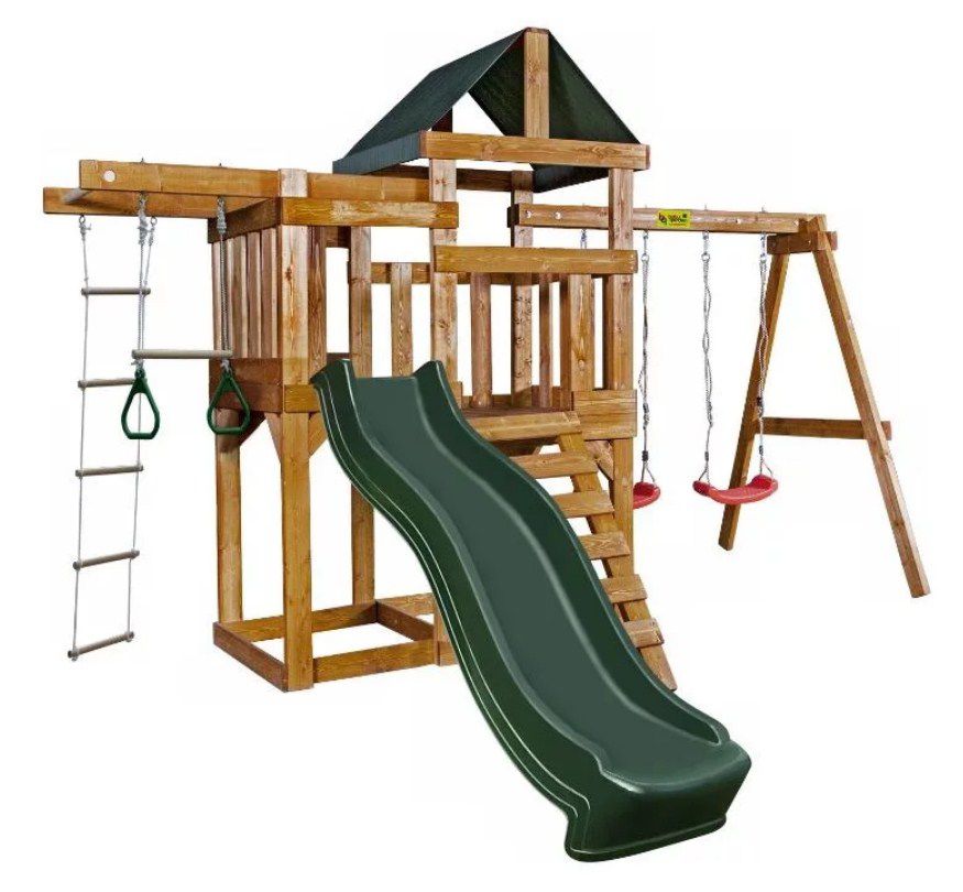 Детская уличная площадка из дерева для дачи и частного дома с туником, кольцами и веревочной лестницей. В комплект входит горка Babygarden пластиковая волновая 2.20 метра с форсункой для водяного спуска.