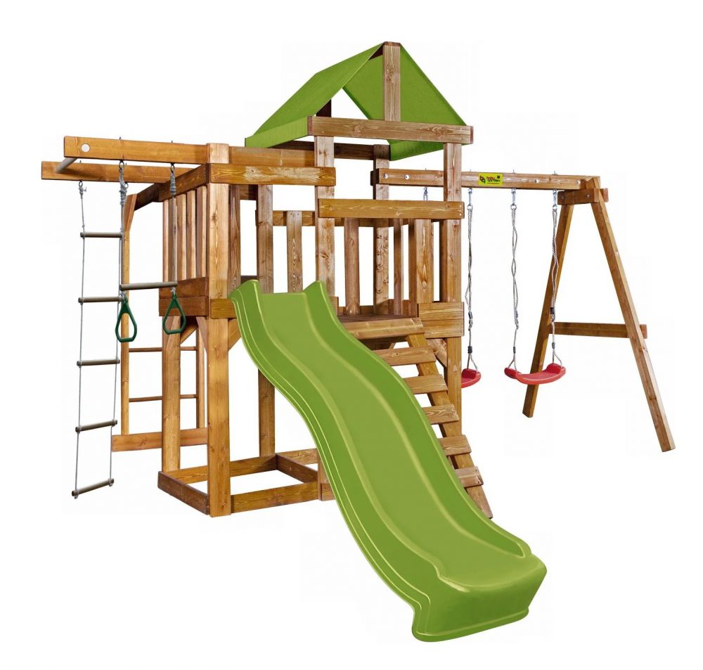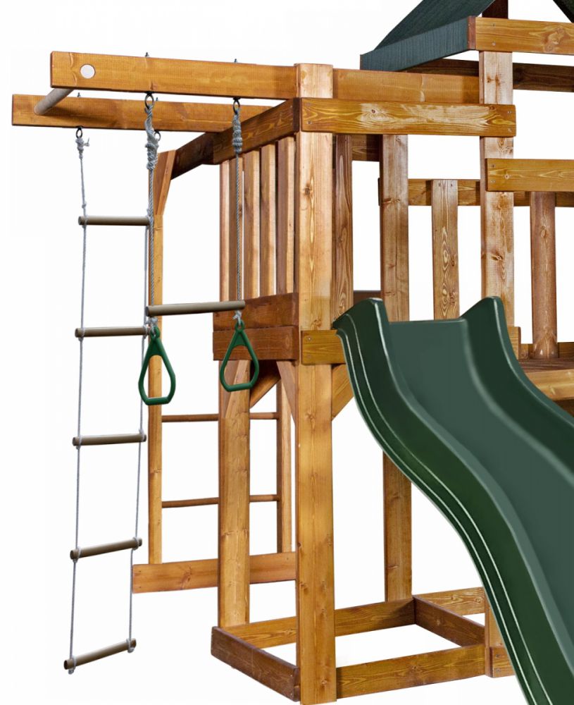 Игровая площадка — один из способов обустроить такую зону. Комплекс из турника, веревочной лестницы, качелей, горки, песочницы в дальнейшем можно дополнить качелей-гнездом, оснастить набором камней для скалолазания или любым другим элементом по желанию. Плюсом деревянной площадки является возможность добавлять новые модули. Вы всегда сможете заказать любой понравившийся элемент отдельно, либо собрать свой вариант изделия.