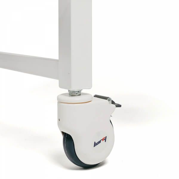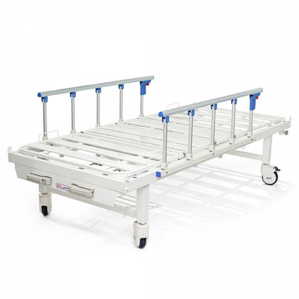 Боковые ограждения защищают пациента от падения, легко складываются и при необходимости снимаются для проведения гигиенических или иных мероприятий. Колеса самоуправляемые с индивидуальным тормозным механизмом, что позволяет перемещать кровать в закрытом помещении и фиксировать ее в любом необходимом положении.