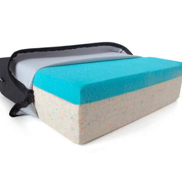 Подушка для инвалидного кресла имеет комбинированный состав – верхний слой выполнен из мягкой пены, а основа изготовлена из плотного ПВВ (пенополиуретан вторичного вспенивания). Это упругий материала с повышенной плотностью, который имеет один недостаток – легко крошится на местах частых заломов и изгибов. Чехол на молнии изготовлен из износостойкой ткани, и его можно стирать.