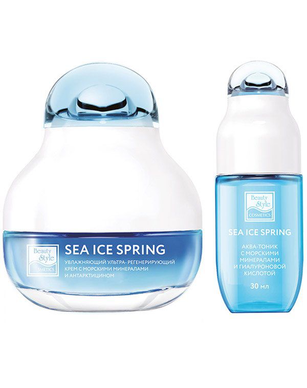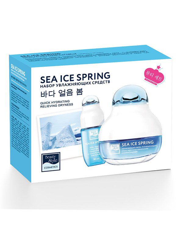 Основа средств - гиалуроновая кислота, которая не просто восполняет дефицит влаги и поддерживает оптимальный уровень увлажнения, но и хорошо освежает кожу. В набор входит аква-тоник с морскими минералами и гиалуроновой кислотой «Sea Ice Spring» и увлажняющий ультра-регенерирующий крем с морскими минералами и антарктицином «Sea Ice Spring». Для максимально эффекта средства нужно использовать совместно. Набор увлажняющих средств Sea Ice Spring рекомендован к использованию лицам с двадцати лет.