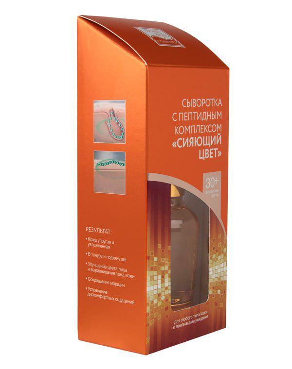 Пептидная омолаживающая сыворотка «Сияющий цвет» помогает существенно притормозить деструктивные процессы в коже, влияет на все признаки изменений и быстро восстанавливает нормальную работу клеток. Она также подходит для профилактического ухода после 30 лет. Сыворотка наносится на чистую, сухую кожу перед нанесением кремообразной / нетканой / альгинатной маски или дневного крема. Препарат не используется в области вокруг глаз.