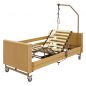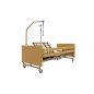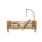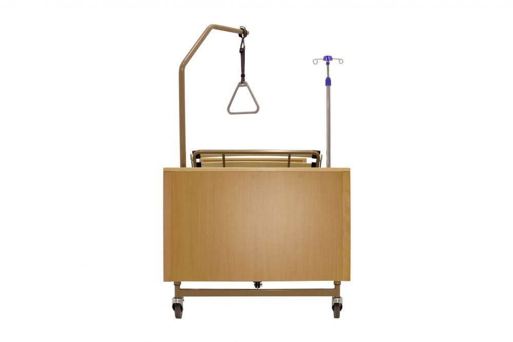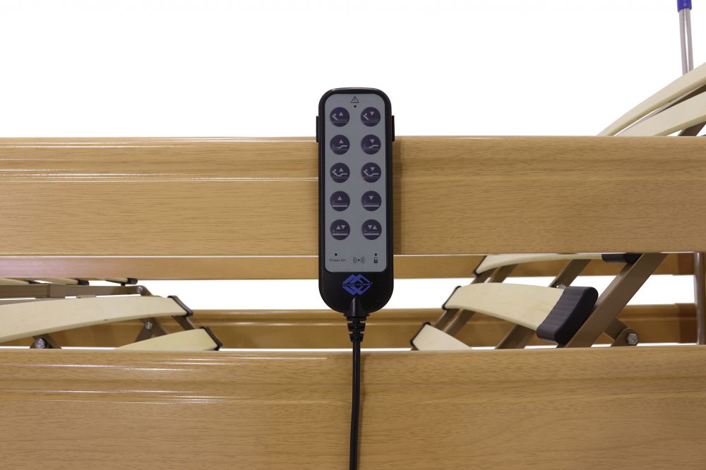 Для материала секций медицинской кровати используются ламели, которые отличаются прочностью и оснащены пластиковыми заглушками. Ложе располагается на стальной раме, поэтому конструкция выдерживает высокие нагрузки. В комплекте с электрокроватью имеются устройство для подтягивания и стойка-держатель для внутривенных инъекций.