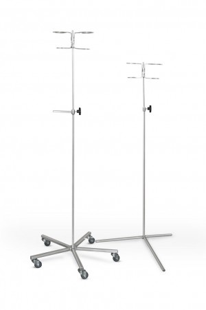 Телескопический штатив для длительных инфузионных вливаний на 5 опорах, верх - из нержавеющей стали, держатель под 2 флакона, меняется высота, с дополнительными крючками для подвешивания.