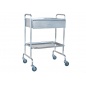 Столик используется для транспортировки медикаментов, оборудования и сопутствующих аксессуаров в медицинских учреждениях. Модель имеет два яруса, а под верхней полкой расположен выдвижной ящик. Четыре колеса обеспечивают конструкции маневренность, но они не оснащены тормозами.