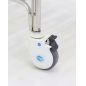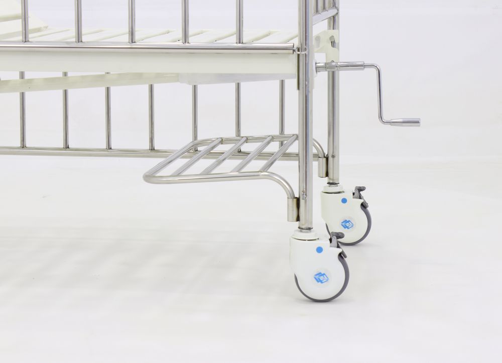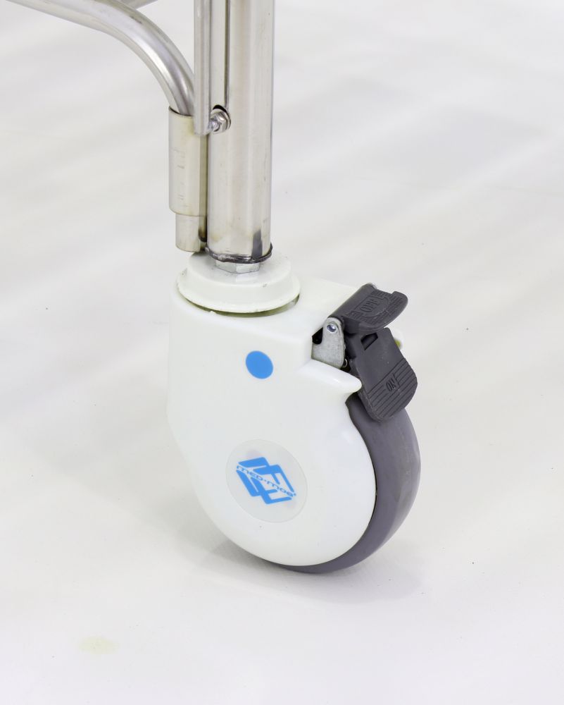 За счет тихоходных колес из полиуретана кровать легко перемещается без беспокойства пациента. Индивидуальные тормоза обеспечивают ей устойчивость. Каркас металлический с порошковым напылением. Покрытие гигиенично и выдерживает частое мытье санитарными составами.