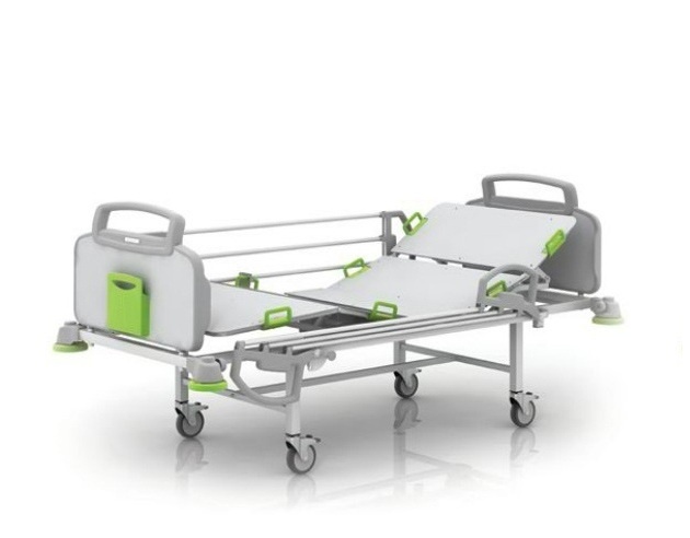 Медицинская функциональная кровать КФ4-03 с пяти секционным ложем, изготовленным из HPL - пластика. На каркасе установлены 4 отбойника для смягчения удара о стены и другие ограждения при перемещении кровати. Кровать оснащена электроприводом, управление секциями осуществляется при помощи пульта. На спинке со стороны ног имеется контейнер для медицинской документации.