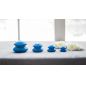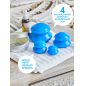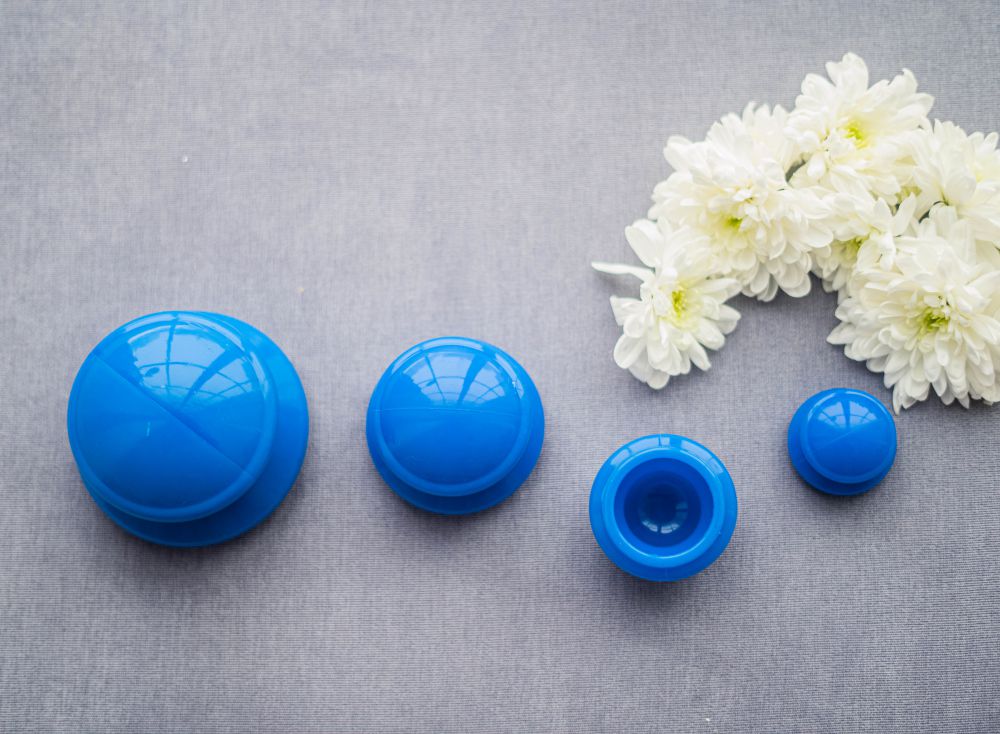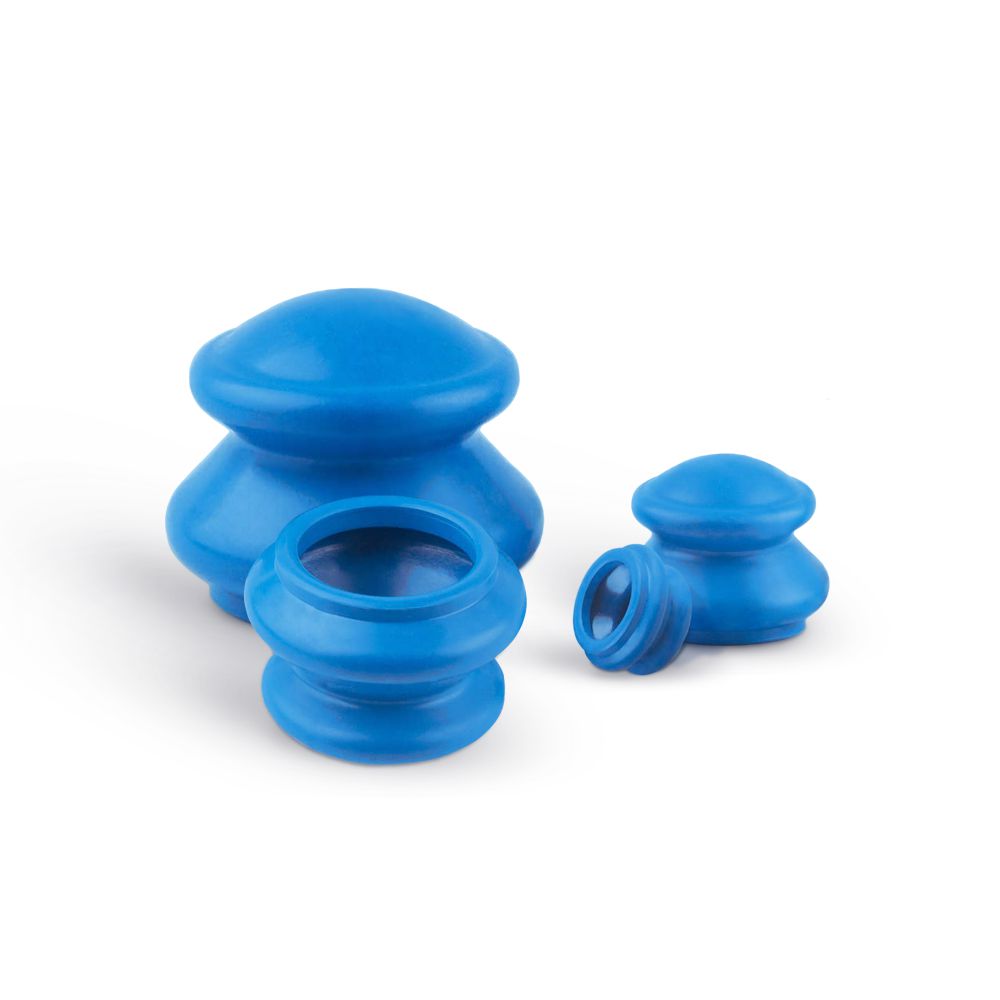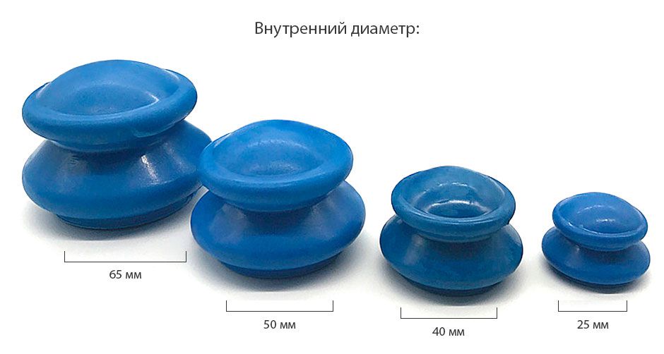 В наборе предусмотрено четыре банки разного диаметра. Минимальный размер составляет 25 мм, а максимальный диаметр достигает 65 мм. Это позволяет подобрать банки нужного размера для любой проблемной зоны тела. В качестве материала изготовления выбрана высокопрочная и долговечная резина, не вызывающая аллергии на коже.