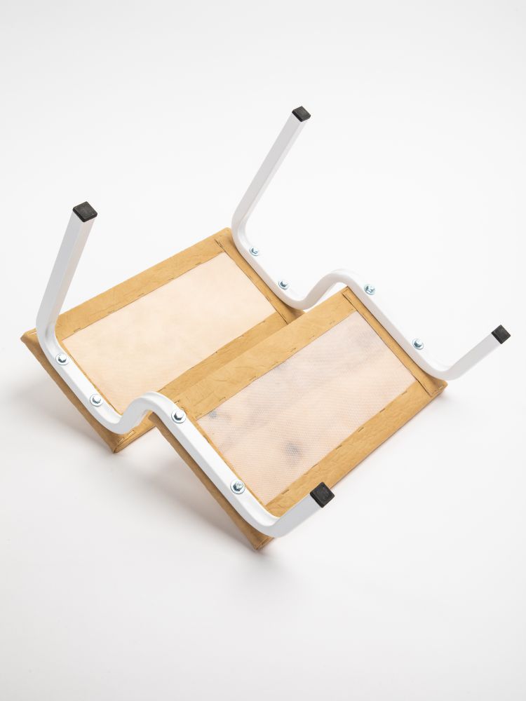 Каркас выполнен из профильной трубы, поэтому устойчив к любым интенсивным нагрузкам. Кроме того, конструкция имеет полимерно-порошковое покрытие – оно защищает изделие от коррозии и повреждений. На видимых торцах труб есть пластиковые заглушки белого цвета.