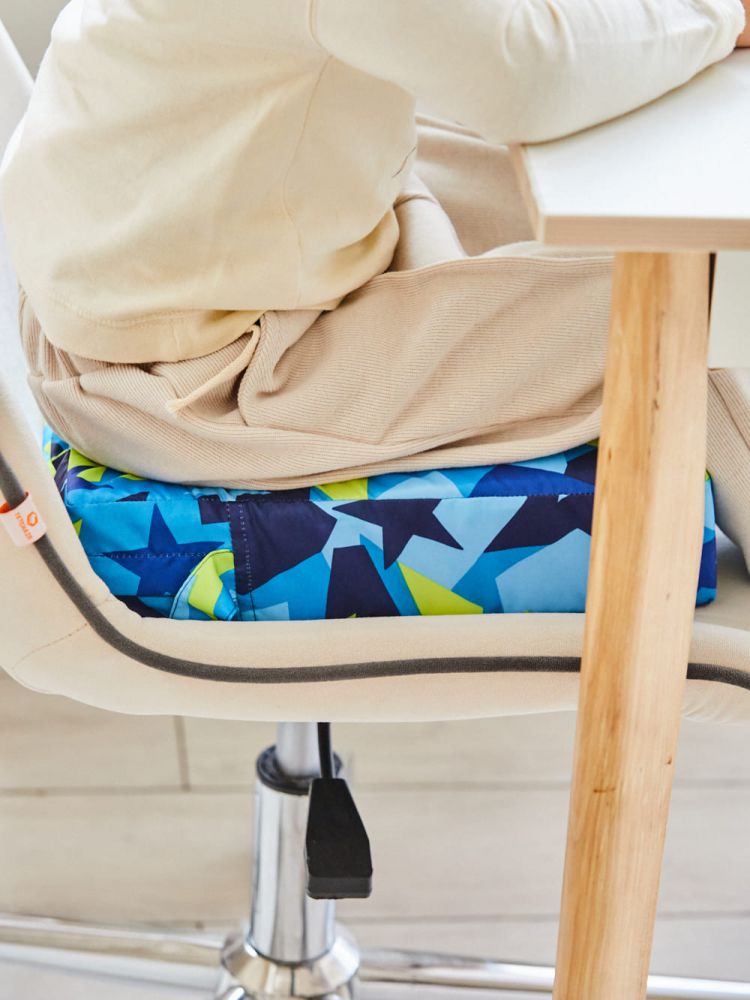 Поднимает сиденье стула на 8 сантиметров, крепко фиксируется двумя регулируемыми ремнями к спинке и сидению стула. Обхват сиденья от 85 сантиметров до 110 сантиметров( из них 32 сантиметра бустер). Обхват спинки регулируется от 65 до 100 сантиметров.