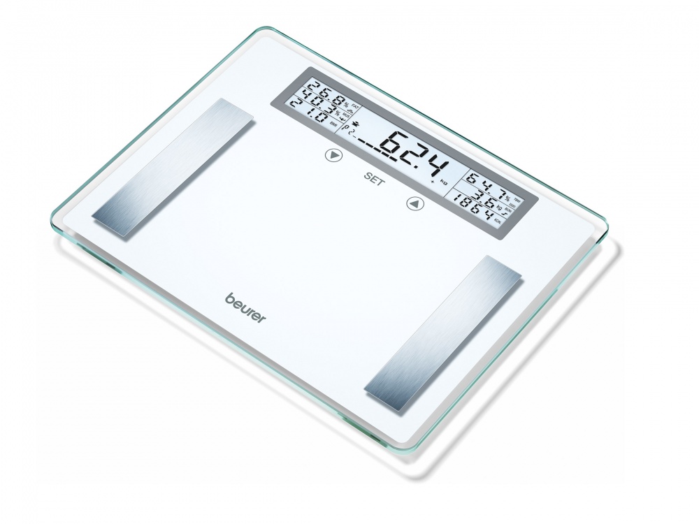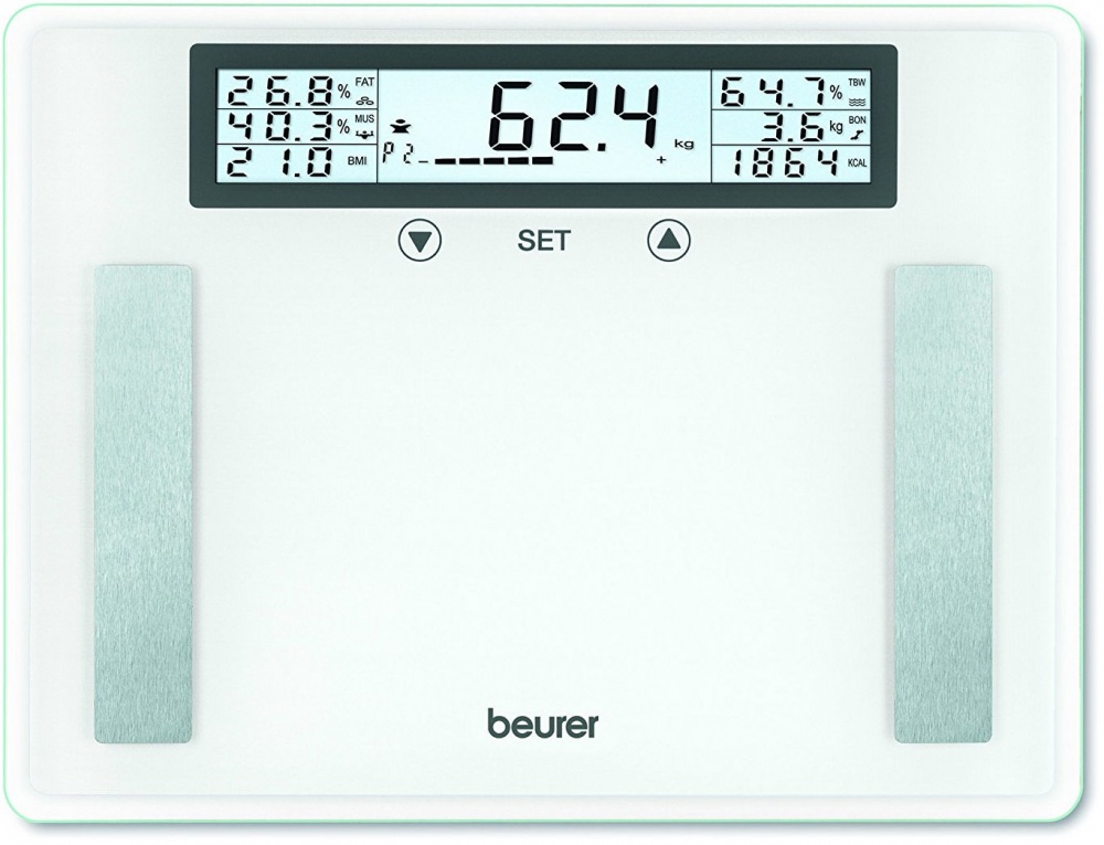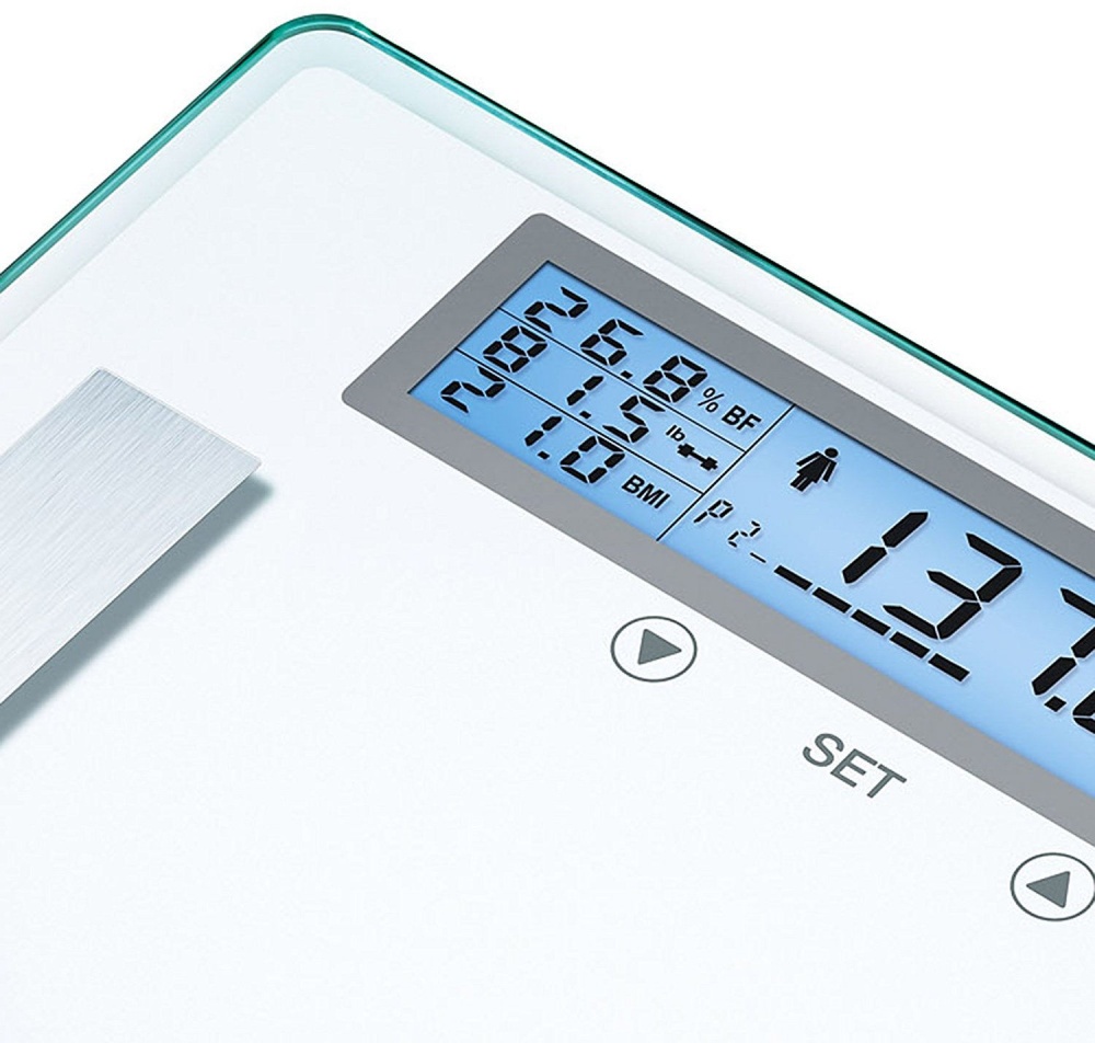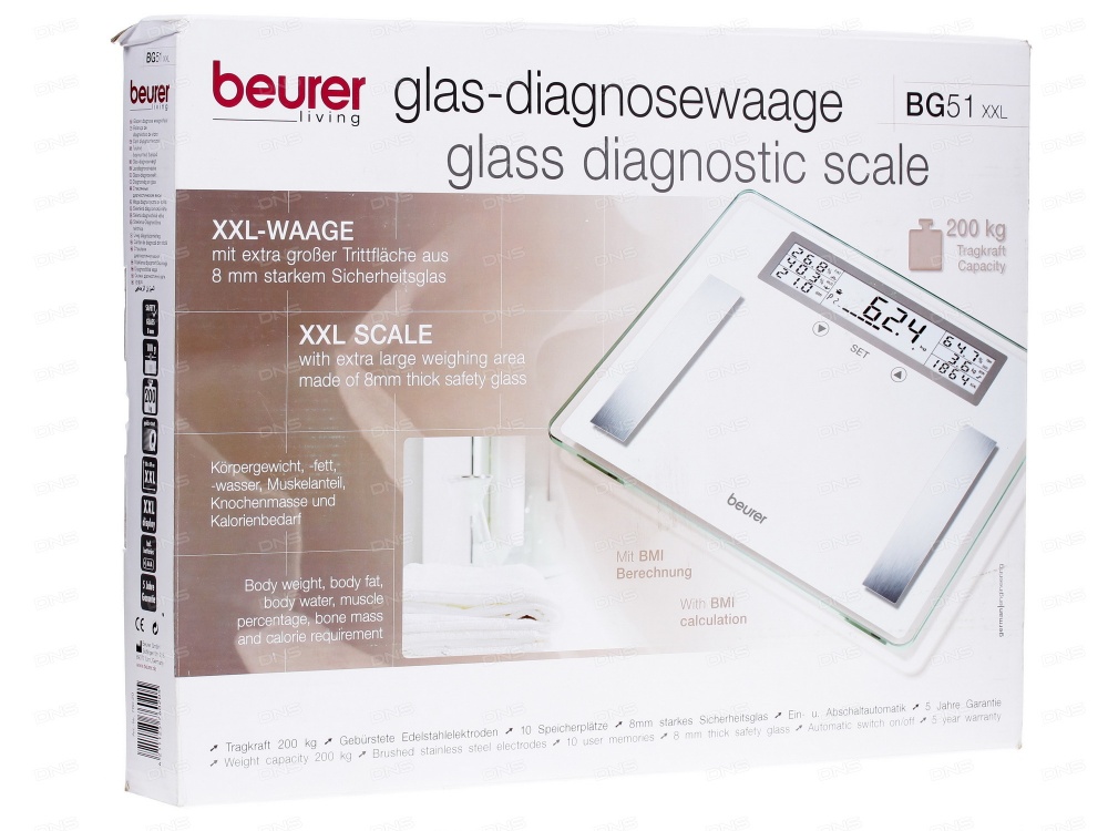 Весы Beurer BG51 XXL выполнены из закаленного стекла, поэтому их дизайн выглядит ультрасовременно. Помимо основных функций для измерения массы тела, в этих весах есть функция расчета индекса массы тела. Платформа просторная и прочная, поэтому подходит для пользователей любой комплекции. Она способна выдерживать без повреждений огромные нагрузки до 200 кг. Стеклянные диагностические весы обладают компактной формой и приятным внешним видом. Могут измерять с точностью до 100 грамм и имеют 5 уровней активности. Кроме этого, прибор поможет пользователю выяснить процентное содержание жира, мышечной массы, костной ткани и воды.