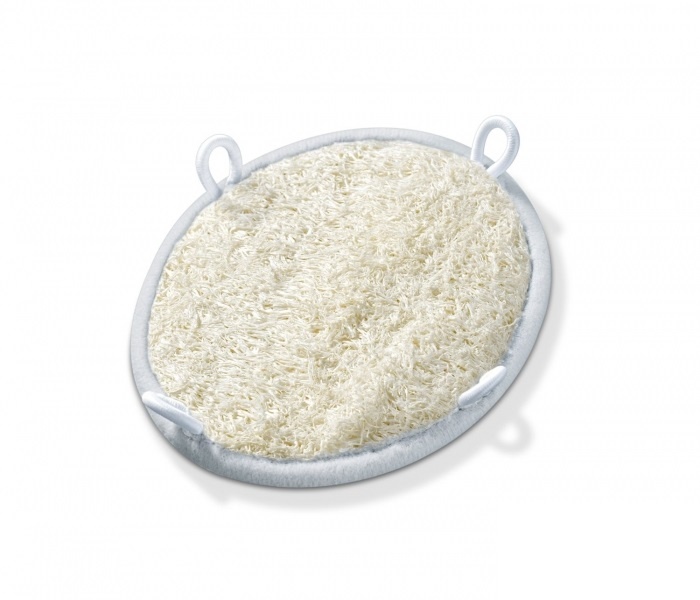 Первая — покрыта люфой, которая является экологическим материалом. Люфа хорошо мылится и отшелушивает омертвевшие частички, усиливает кровоток, разглаживает и придает коже упругость. Насадку с люфой эффективно применять при борьбе с целлюлитом.