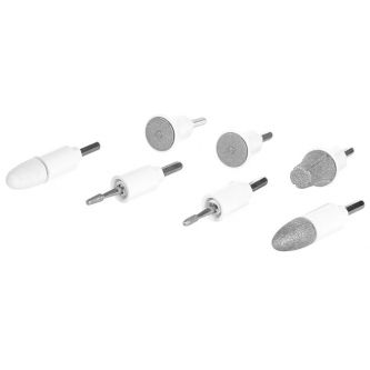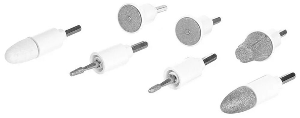 В комплекте 7 сменных насадок - сапфировый диск мелкозернистый, сапфировый диск крупнозернистый, сапфировый конус, войлочный конус, сапфировая шлифовальная насадка, цилиндрический бор, бор в форме пламени.