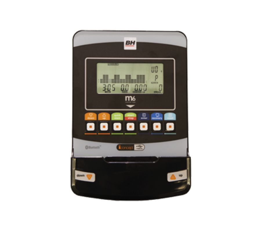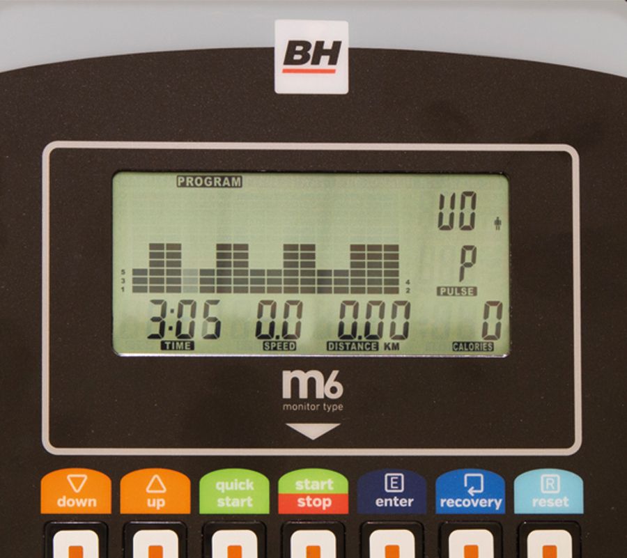 Эллиптический тренажер BH Fitness NLS14 Top Dual с задним приводом маховика для домашнего использования. Сенсорные датчики пульса на поручнях. Тренировочный компьютер представлен многофункциональным черно-белым LCD-дисплеем M6.