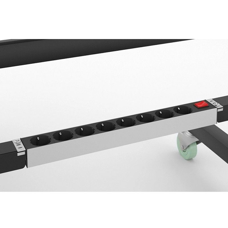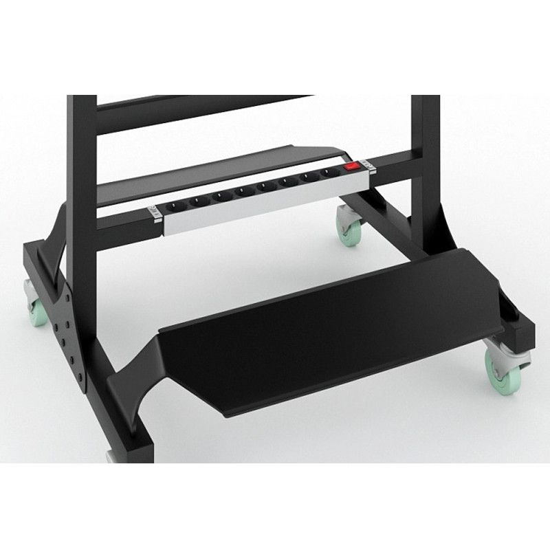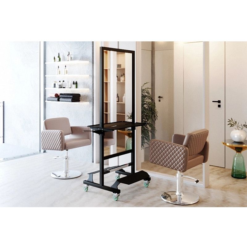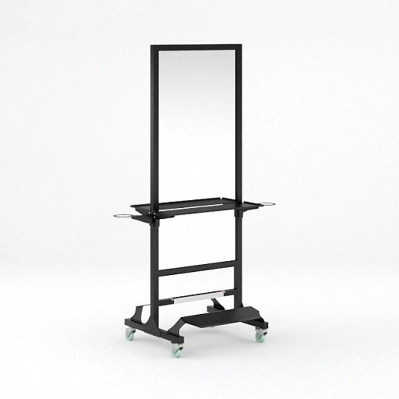 Мобильное парикмахерское зеркало MODUS изготовлено из прочного металлического профиля и оснащено надежными прорезиненными колесами, обеспечивающими ему высокую мобильность. Зеркальные полотна большой площади позволяют организовать на минимальном пространстве два рабочих места парикмахера. Модель оснащена двумя широкими складными полками с возможностью регулировки по высоте, комплектом подставок под ноги клиента, фенодержателями и блоком на восемь розеток.