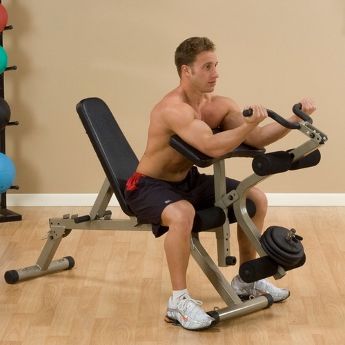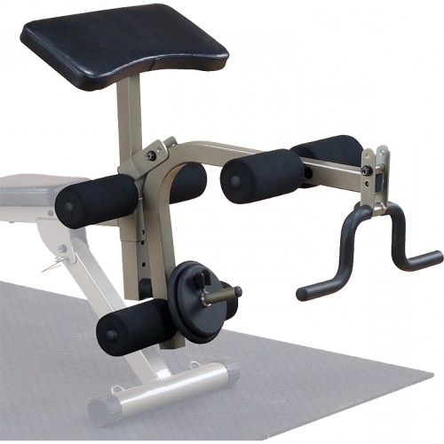 Тренажер предназначен для выполнения упражнений на разгибание ног сидя и сгибание ног лежа, бицепс. Предназначен для использования в качестве опции с регулируемой скамьей Body-Solid BFFID10. Безопасная и устойчивая конструкция из высокопрочной стали. Легкое и быстрое крепление к скамье. 6 удобных валиков для ног из пены высокой плотности диаметром 10 сантиметров обеспечивают комфорт при выполнении упражнений. Съемная, регулируемая по высоте парта Скотта с подушками толщиной 44 миллиметра обеспечивает комфортное выполнение упражнений на бицепс. Штырь для дисков диаметром 25 миллиметров позволяет использовать в качестве нагрузки как стандартные (26 миллиметров) свободные веса, так и олимпийские (51 миллиметр) с применением адаптера Body-Solid OAS14. Порошковое покрытие металлических поверхностей предохраняет от сколов и выцветание краски
