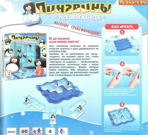 В комплекте: - 5 льдинок с фигурками пингвинов на каждой; - пластмассовое игровое поле; - буклет с заданиями; - правилами игры.