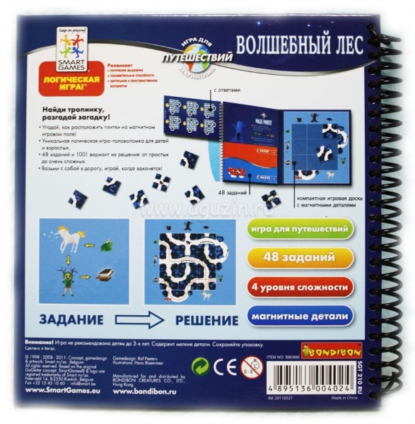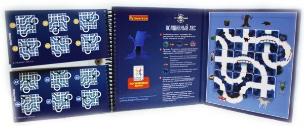 Ребенок может выбрать карточку с заданием, а потом он должен расположить детали на игровой поверхности, чтобы разрешить сложную загадку. Нужно разложить девять элементов таким образом, чтобы объединить персонажей, указанных в упражнении. Как только будут созданы нужные тропинки при расположении на игровом поле всех деталей, задание будет выполнено. Каждое из заданий имеет несколько вариантов решения, один из них указан на последней странице пособия.