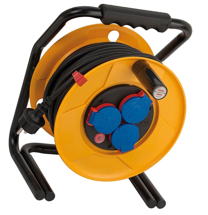 Электрический удлинитель на катушке фирмы Brennenstuhl имеет противоударный пластиковый корпус с оцинкованной рамой, которая делает конструкцию прочной и устойчивой. Устройство оснащено тремя защищенными розетками, на которые надеты резиновые заглушки, индикатором перегрева и термозащитой.