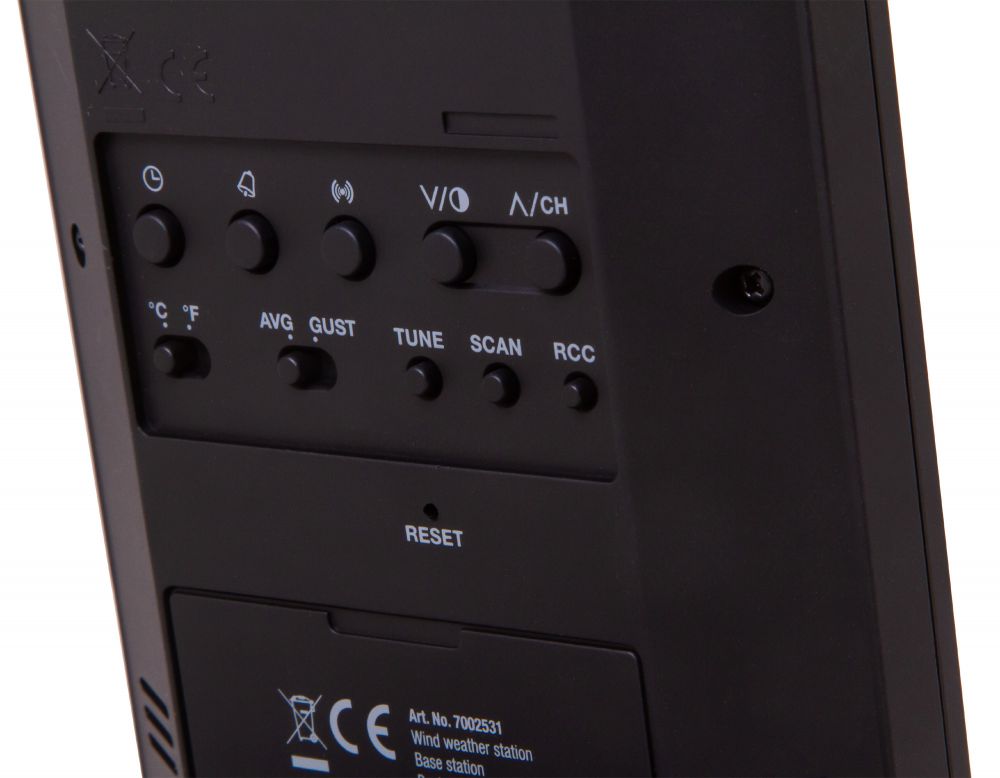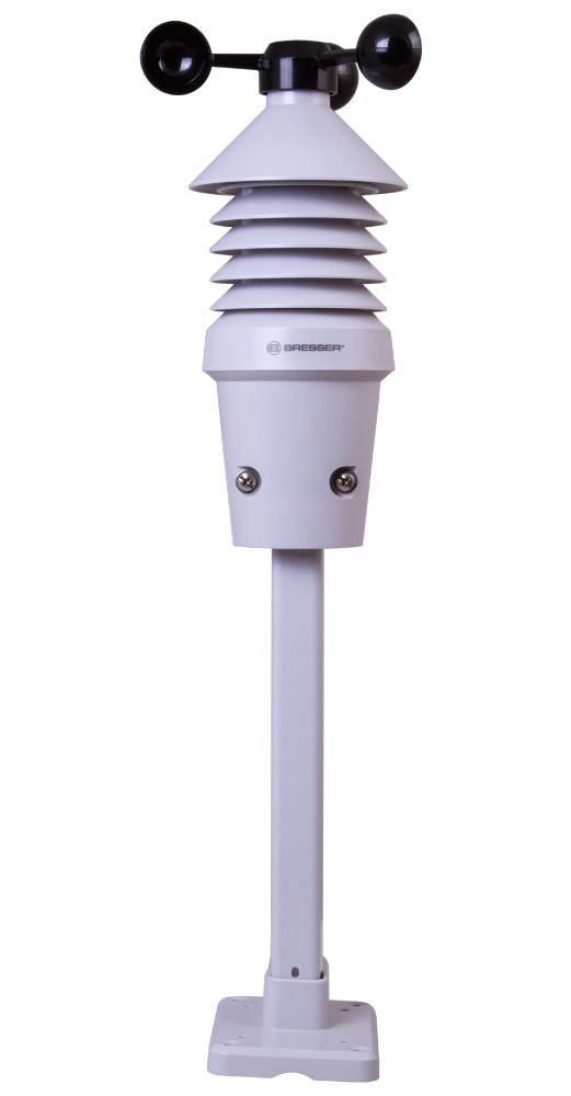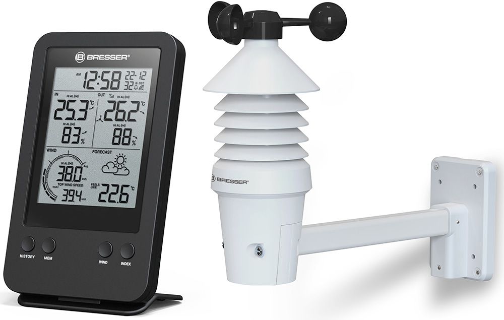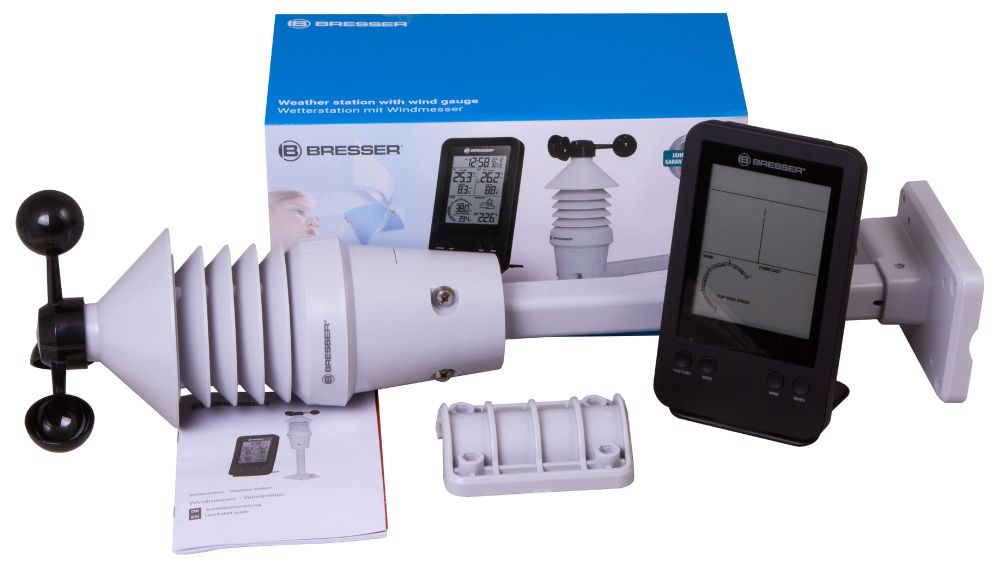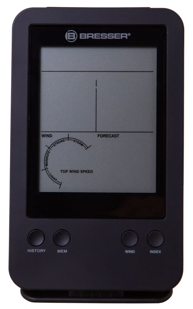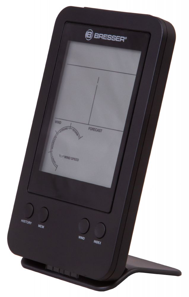 Анемометр (ветромер) Bresser – прибор для тех, кто привык держать капризы погоды под контролем. Все измерения на улице проводит специальный датчик. Основной модуль проводит измерения внутри помещения, а также получает информацию от датчика. Данные выводятся на встроенный экран метеостанции. В верхней части экрана показываются время и дата. Ниже – показания температуры и влажности воздуха. В самом низу расположен блок с информацией о скорости ветра и иконка прогноза погоды. Под экраном находятся кнопки управления метеостанцией.