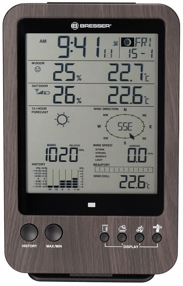База для метеостанций Bresser «5 в 1» WTW – это основной модуль, который можно установить дома в дополнение к уже имеющейся метеостанции. Он будет аналогичным образом собирать показания подключенных датчиков, выводить их на встроенный экран, а также показывать собственные измерения. У базы также есть функции часов, календаря и будильника.