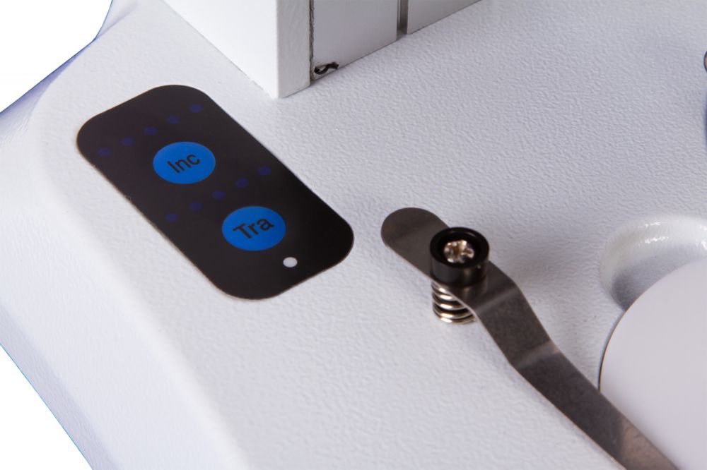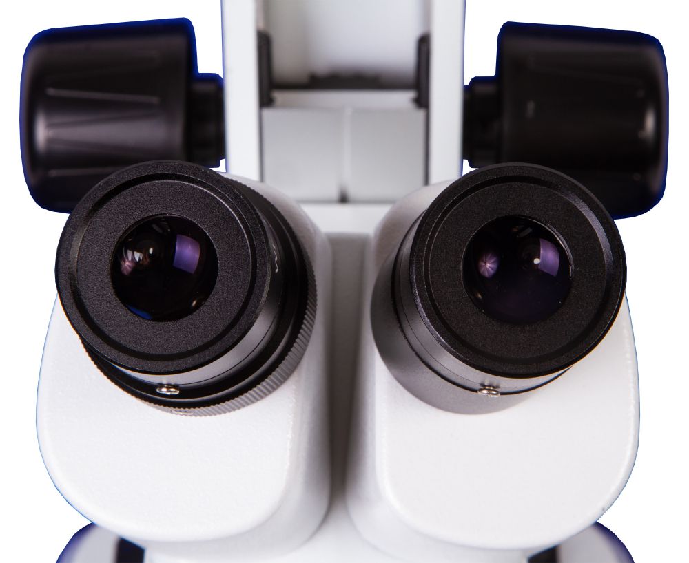 Микроскоп снабжен бинокулярной насадкой, причем оба окуляра обеспечивают хороший обзор и имеют резиновые наглазники. Объектив поворотной конструкции позволяет менять увеличение прямо во время наблюдений. Предметный столик неподвижный, его поверхность можно выбирать в зависимости от исследований - доступны черно-белая пластина и пластина из матового стекла. Для фиксирования микропрепаратов используются металлические зажимы.