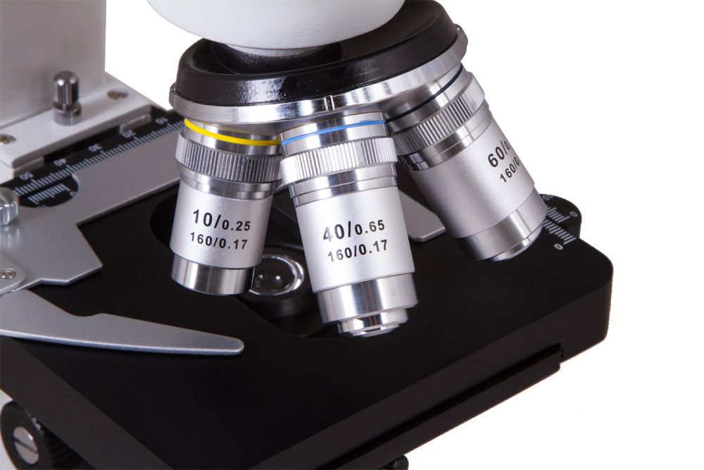 Оптическая система микроскопа состоит из монокулярной поворотной на 360° насадки и револьверного устройства на 4 объектива. В комплект поставки включены - окуляр 10х и объективы 4х, 10х, 40х и 60х. Все объективы ахроматические, поэтому оптика минимизирует аберрации и выравнивает поле зрения.