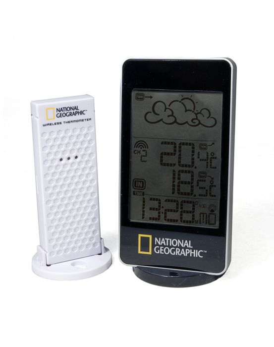 ЖК-экран метеостанции поделен на три блока. Первый отображает информацию с помощью специальных символов, второй показывает температуру, а третий – время. На задней стенке корпуса расположены кнопки управления, с помощью которых можно настроить метеостанцию и получить дополнительную информацию. Метеостанция Bresser National Geographic способна также хранить и обрабатывать информацию.