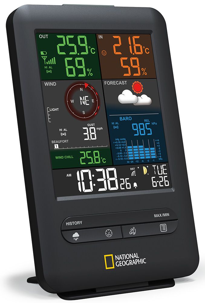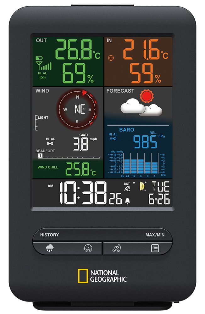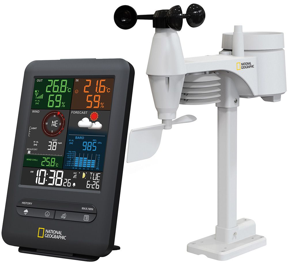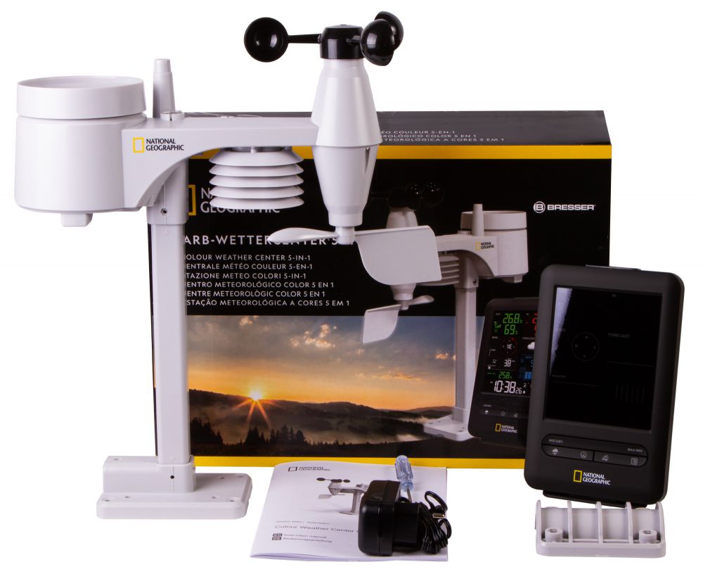 Метеостанция Bresser National Geographic «5 в 1» – это профессиональный метеорологический прибор, который позволяет отслеживать все изменения погоды за окном. Она комплектуется мультидатчиком, который измеряет атмосферное давление, температуру, влажность воздуха, определяет скорость и направление ветра, а также уровень осадков. Метеостанция умеет составлять прогноз погоды на 12 часов, показывает время и дату, имеет встроенный будильник.