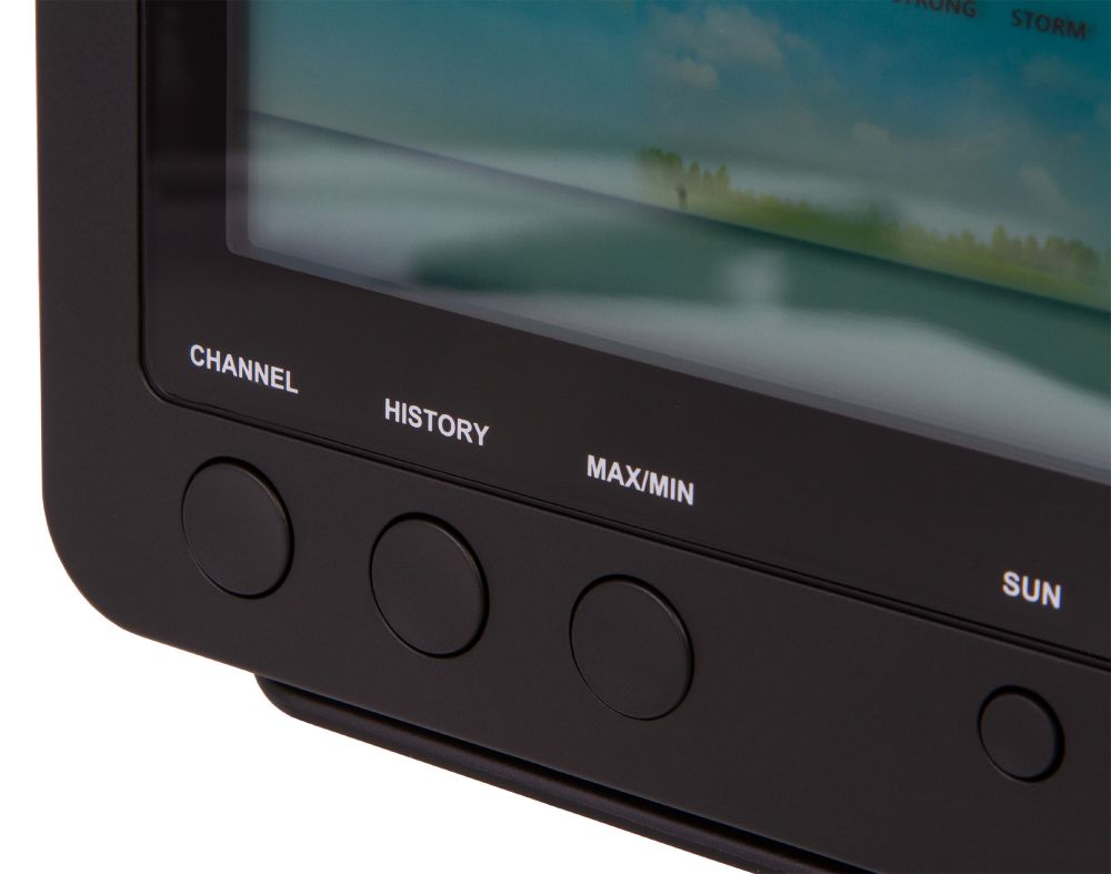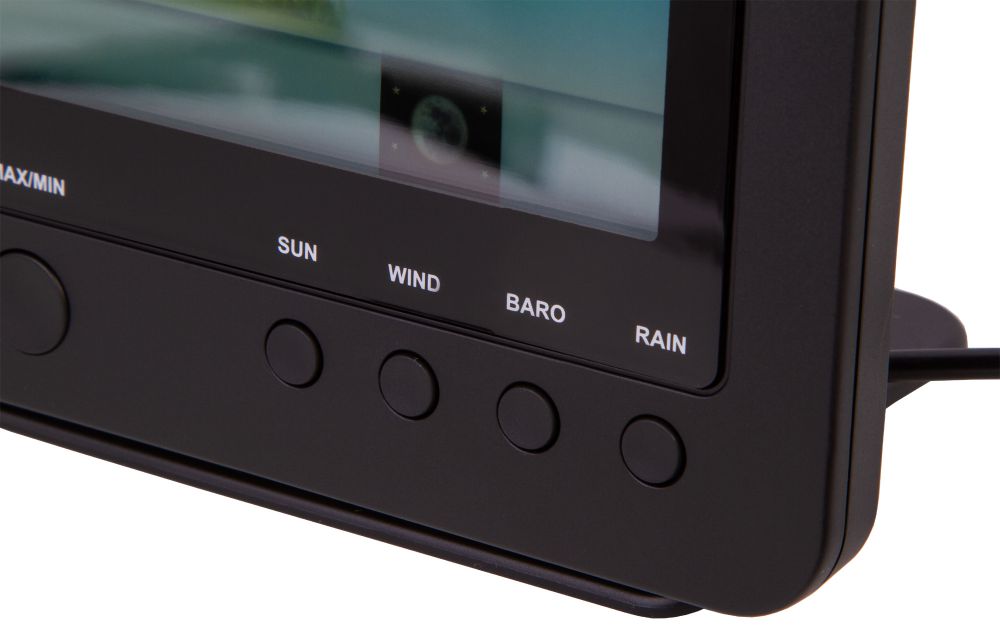 Все капризы погоды отображаются на цветном экране с диагональю 5,7 дюйма (14,4 см). Индикация четкая, изображения и символы хорошо различимы с большого расстояния, есть подсветка экрана с регулировкой яркости. Экран разделен на блоки, в каждом отображается строго определенный тип показаний – это помогает быстро ориентироваться в многообразии получаемых данных. В метеостанции установлен модуль Wi-Fi, благодаря которому можно синхронизировать прибор с популярными погодными приложениями.