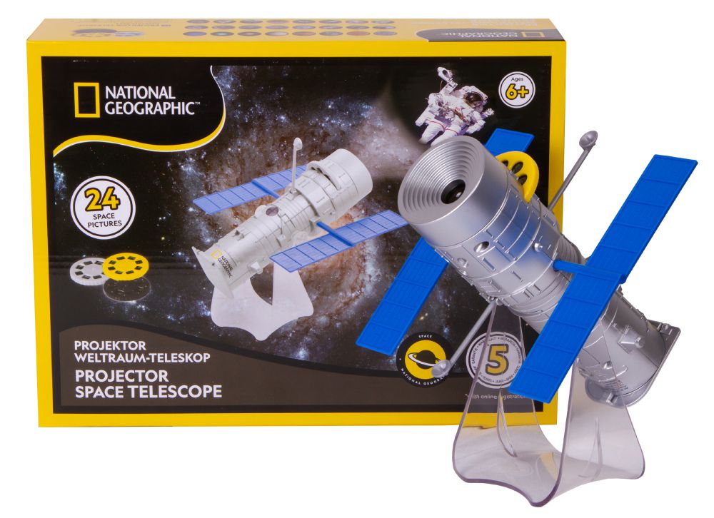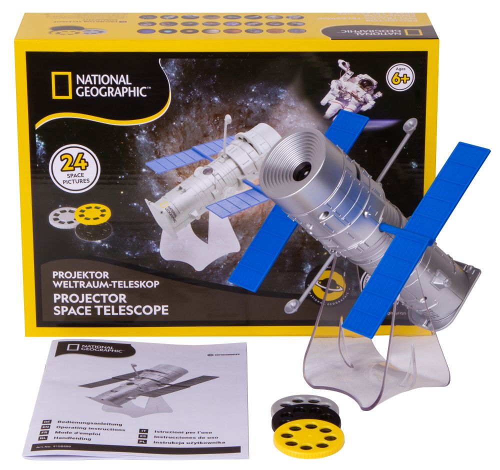 Проектор-ночник Bresser National Geographic «Космический телескоп» – это небольшой и простой в управлении прибор, который позволит познакомить ребенка с основами астрономии. С его помощью на стену или потолок можно проецировать изображения с дисков, идущих в комплекте. Всего доступно 24 слайда с изображениями космонавтов, планет и галактик. Площадь проекции получается достаточно большой, а изображение выходит четким. Угол проекции можно регулировать.