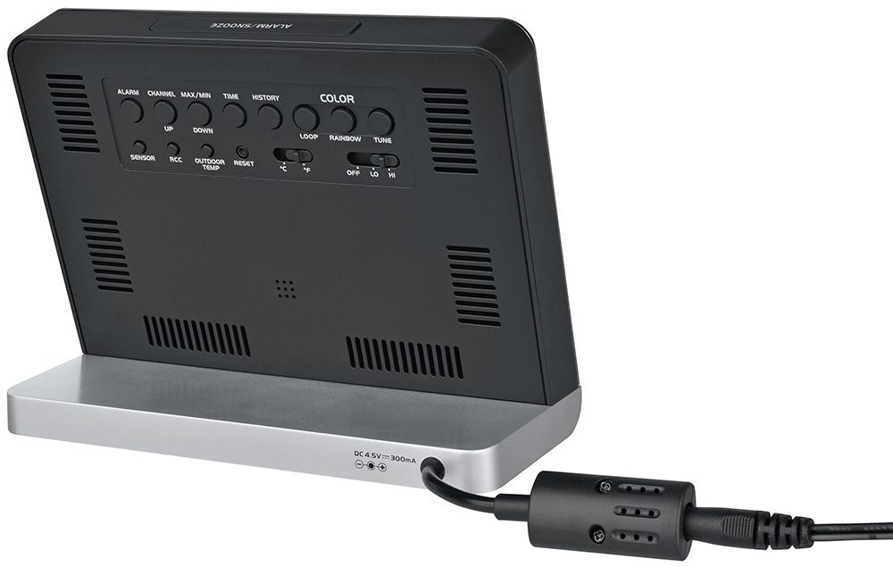 Прибор показывает текущее время, составляет прогноз погоды на 12 часов, измеряет температуру и влажность воздуха в помещении и на улице. Есть будильник. Внешний датчик можно разместить на расстоянии до 50 метров от основного модуля, вся информация будет передаваться по радиоканалу. Удобно, что для питания датчика и метеостанции используются батарейки – это позволит не заполонять помещение лишними проводами. При необходимости основной модуль можно запитать и от сети переменного тока.