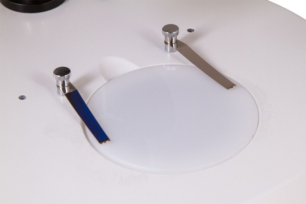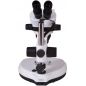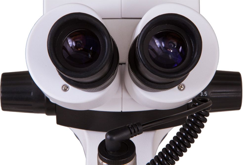 Бинокулярная насадка дает возможность вести наблюдения сразу двумя глазами – это снижает нагрузку на зрение и позволяет работать с микроскопом длительное время, не испытывая усталости. Окуляры снабжены резиновыми наглазниками и кольцами диоптрийной коррекции. Окулярная насадка установлена на штатив, ее можно перемещать по вертикали, отдаляя или, наоборот, приближая к микропрепарату. При групповых исследованиях незаменимой функцией станет возможность разворота насадки на 360°. Увеличение панкратического объектива регулируется отдельной ручкой. Общая кратность микроскопа находится в диапазоне от 7 до 45 крат.