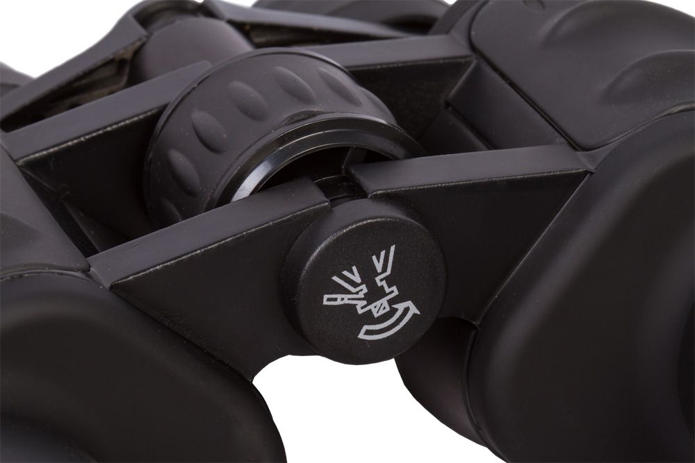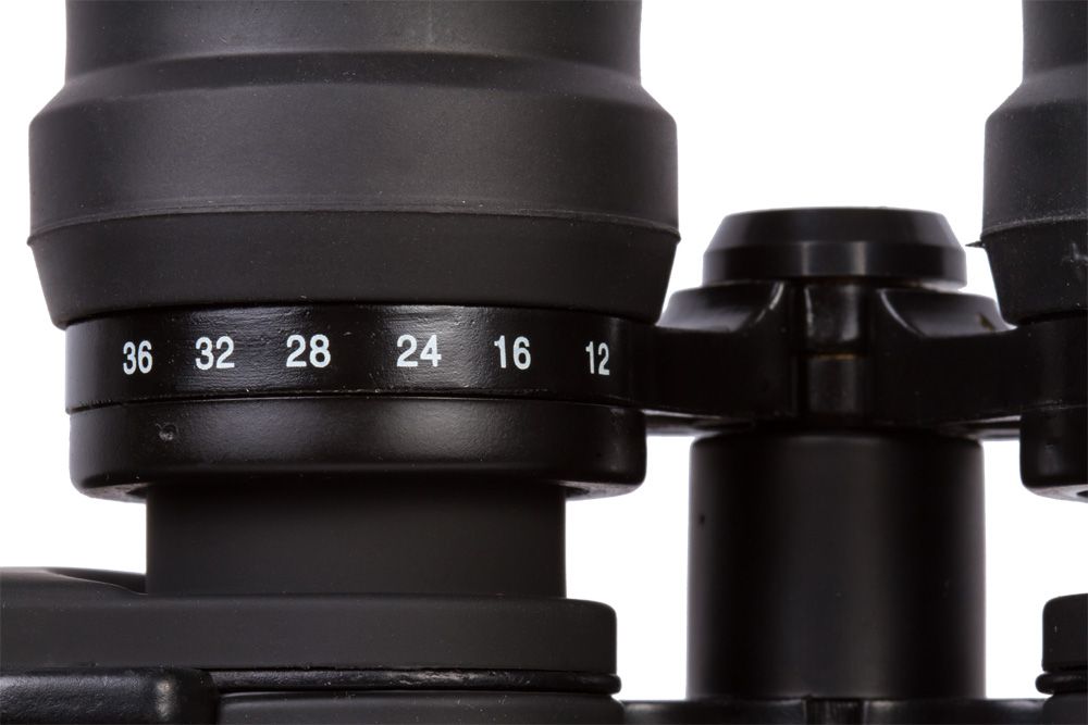 При сильном увеличении для четкости изображения рекомендуется устанавливать бинокль на штатив (не входит в комплект). Для удобства использования в комплект входит ремень для ношения бинокля на шее. У бинокля центральная фокусировка (минимальная дистанция фокусировки составляет 10 метров при увеличении 12x). Для изменения кратности увеличения на правом окуляре бинокля имеется удобный рычажок. В левом окуляре имеется шкала кратности увеличения (12-36 крат).