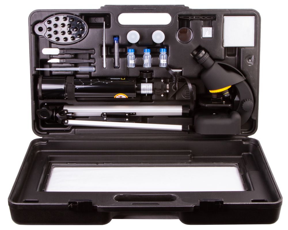 Набор Bresser National Geographic разработан специально для детей. В нем два оптических прибора микроскоп поможет освоить азы биологии, а телескоп – изучить основы астрономии. Набор дополнен необходимыми аксессуарами, поэтому докупать что-то еще не понадобится. Этот набор станет прекрасным подарком юному астроному, пытливому исследователю окружающего мира и просто увлеченному наукой ребенку.