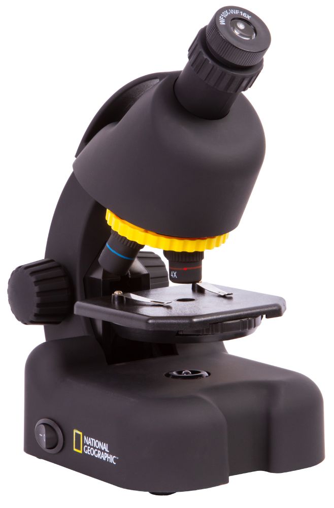 Микроскоп Bresser National Geographic 40–640x – световой микроскоп для наблюдения прозрачных объектов. Снабжен нижней светодиодной подсветкой, позволяет работать с готовыми микропрепаратами и самостоятельно изготовленными образцами. В комплекте его набор для опытов и адаптер для смартфона. Последний позволяет закреплять на окуляре мобильное устройство, чтобы использовать его камеру для фото- и видеозаписи исследований.
