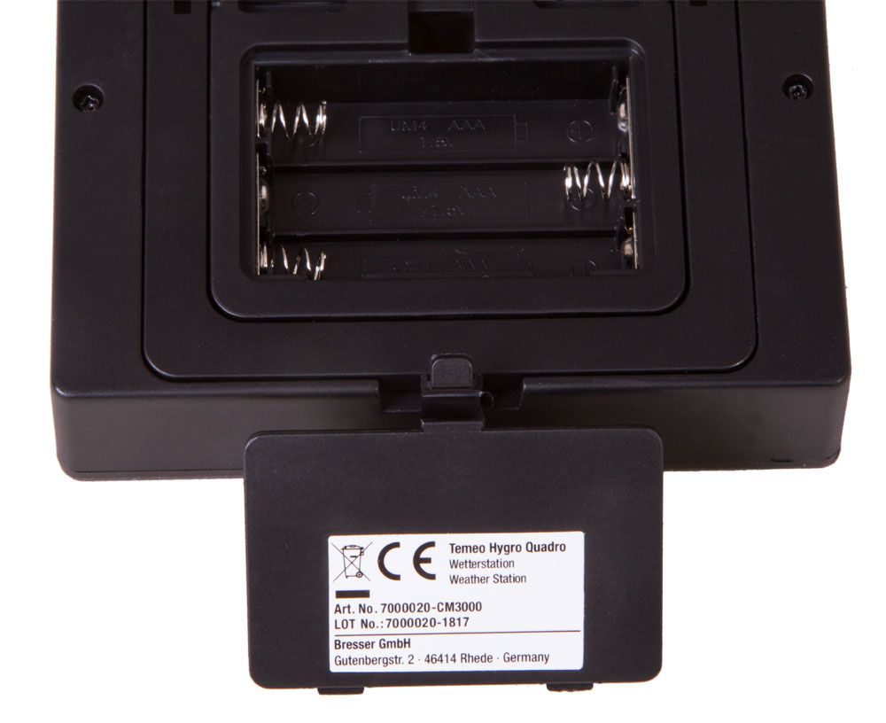 Bresser Temeo Hygro Quadro – метеостанция со встроенными термометром и гигрометром. Она измеряет температуру, влажность воздуха и уровень общего комфорта в помещении и за его пределами. Метеостанция снабжена тремя наружными датчиками, каждый из которых можно установить на расстоянии до 30 метров от нее. Благодаря защите от брызг за них можно не переживать.