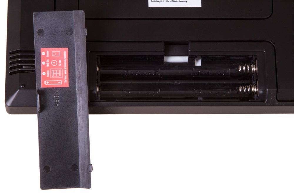 В основном модуле уставлен большой монохромный цифровой дисплей. Благодаря крупной и четкой индикации все показания можно увидеть с большого расстояния и при слабой освещенности. Верхняя половина экрана отведена под цифровые часы, нижняя – под погоду. Здесь отображаются иконка прогноза погоды, влажность воздуха и температура внутри и снаружи помещения.