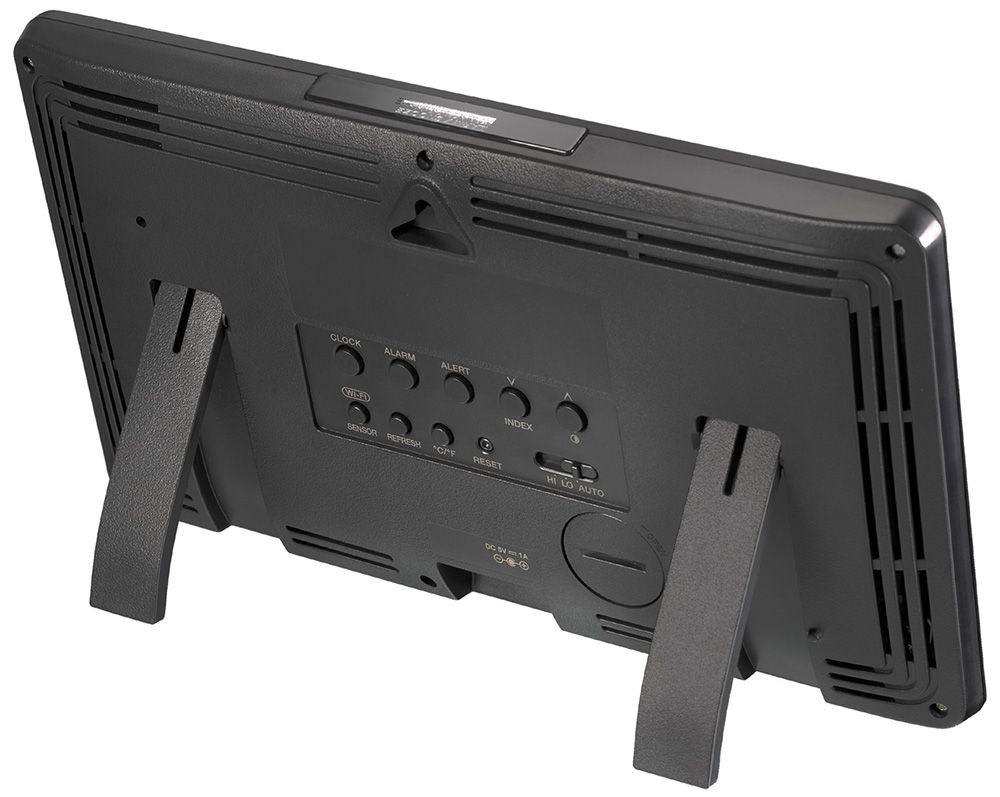 Связь с датчиком происходит без участия проводов – по радиоканалу. Питание прибора – сеть переменного тока. Базу можно ставить на стол или вешать на стену, но только внутри помещения.